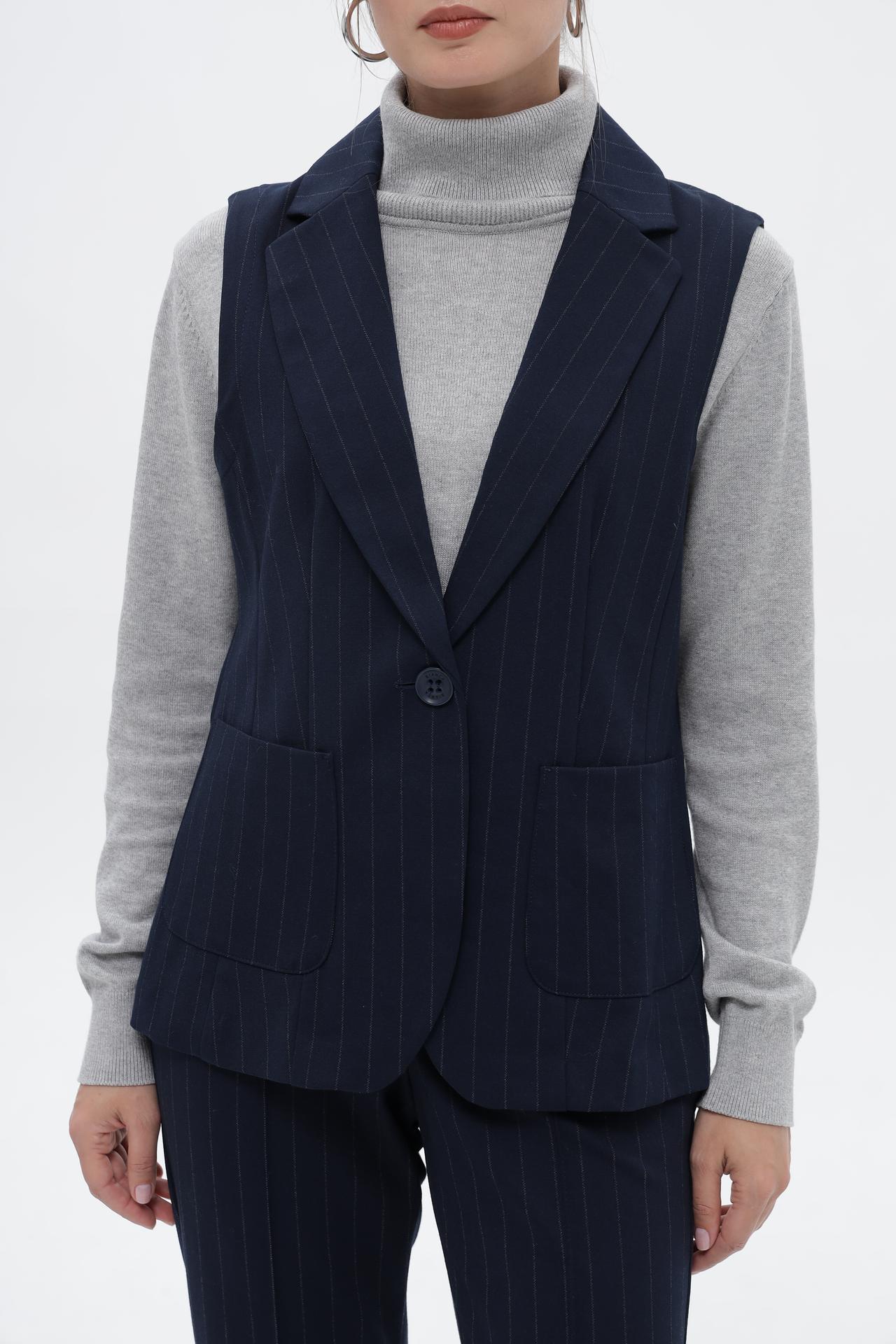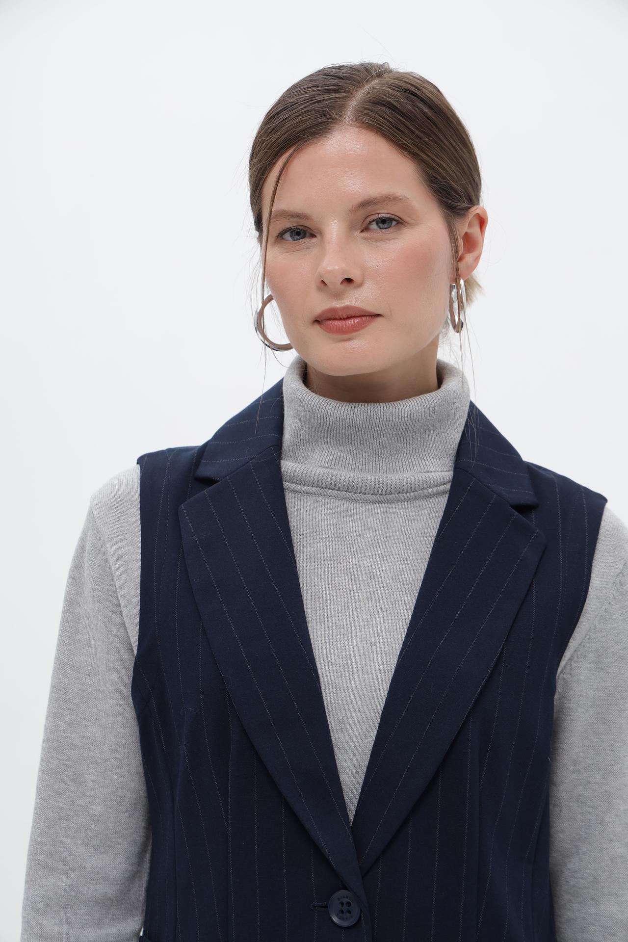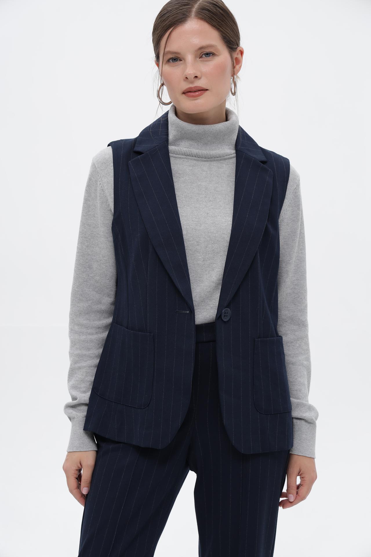 Элегантный жилет Bianca — идеальное дополнение к вашему деловому и повседневному гардеробу. Классический темно-синий цвет в сочетании с деликатной вертикальной полоской создает строгий, но утонченный образ. Этот жилет прекрасно подчеркнет вашу индивидуальность и добавит изысканности любому наряду.