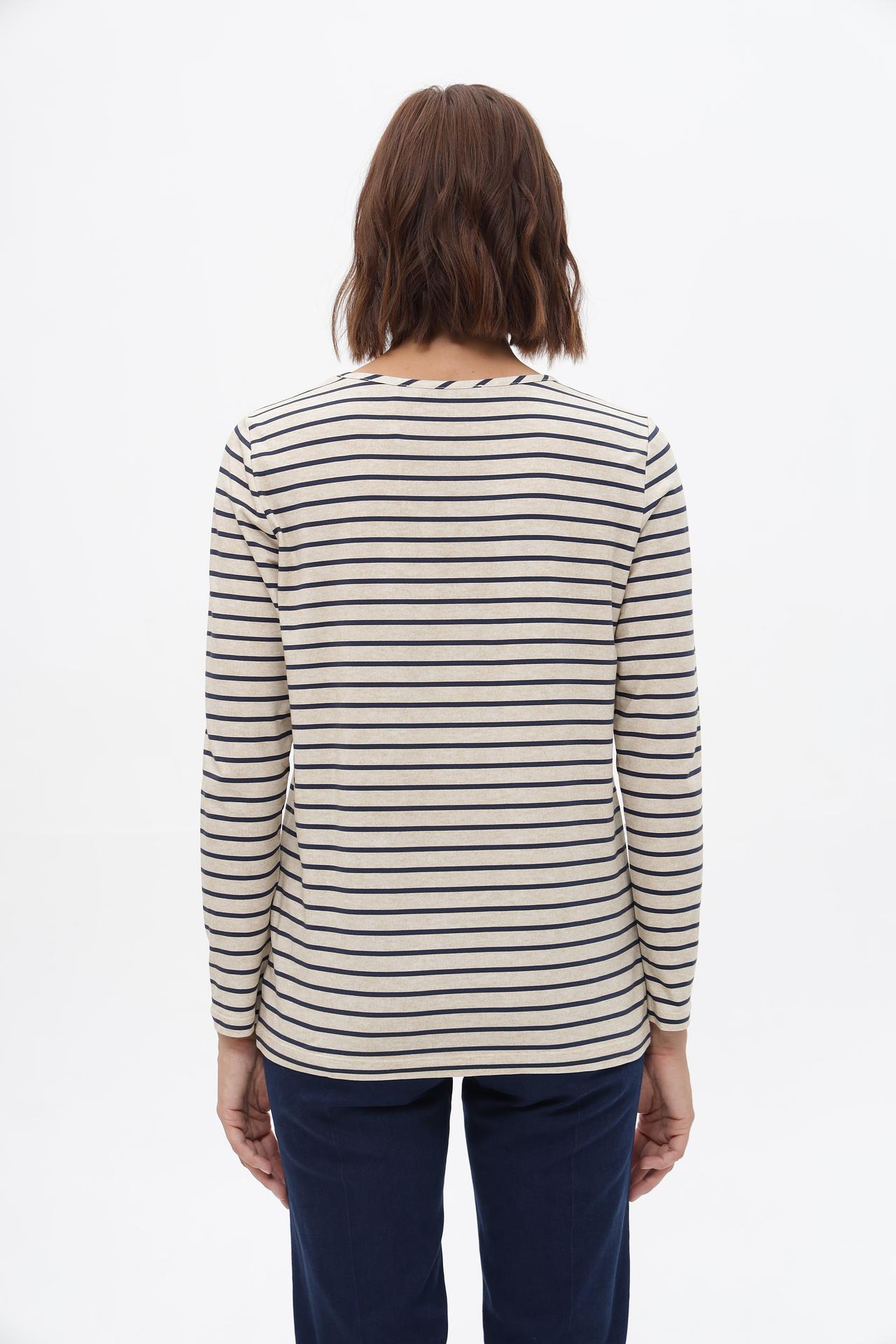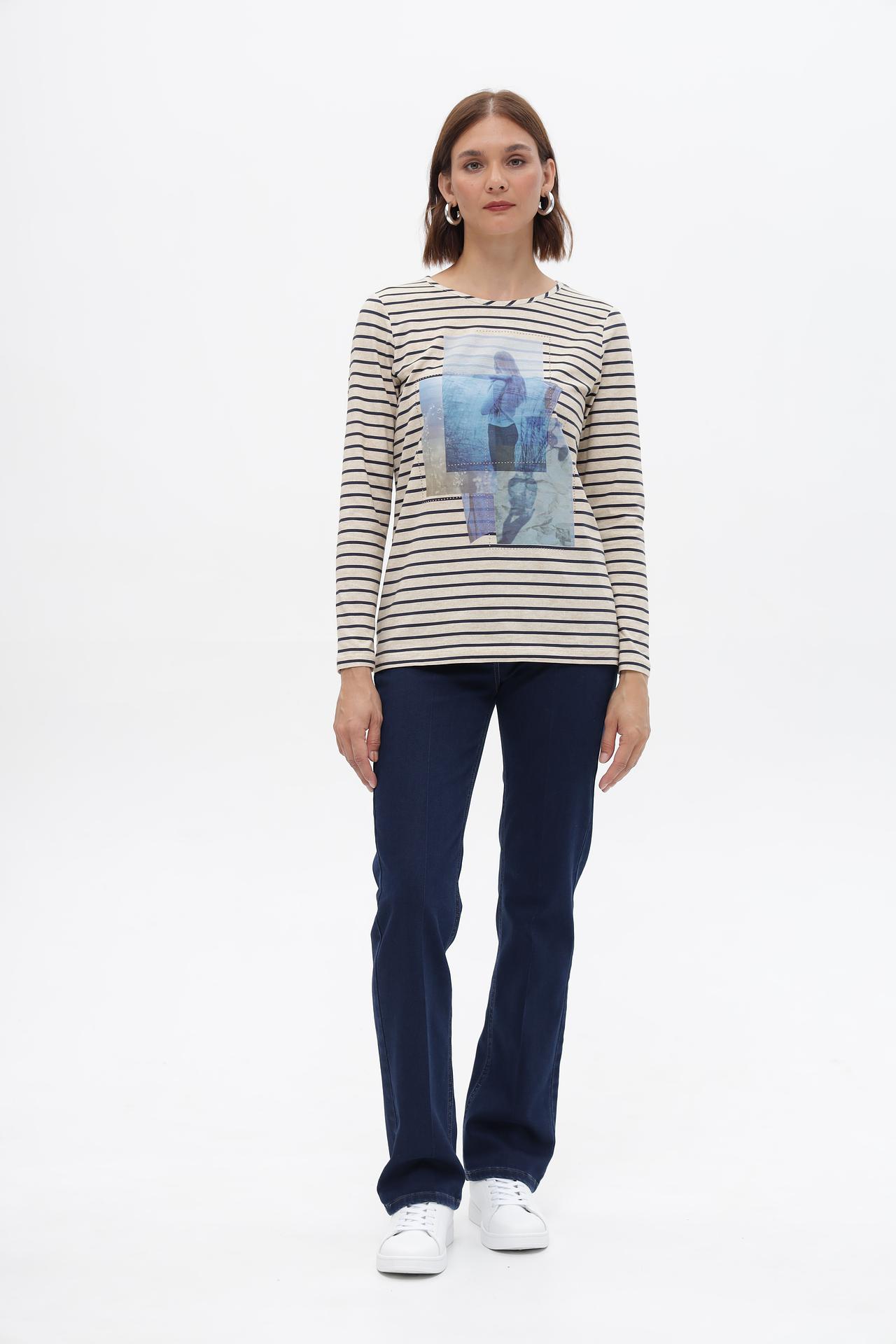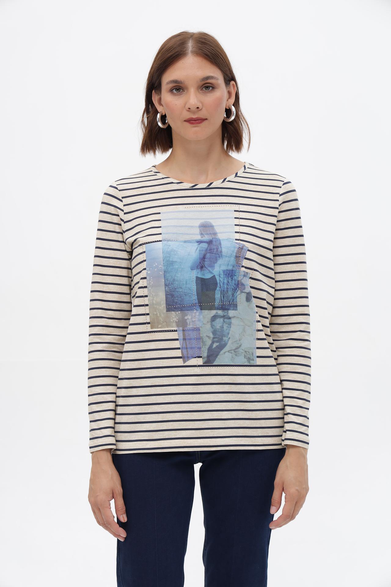Элегантная женская футболка Bianca с длинным рукавом – идеальный выбор для создания повседневных и утонченных образов. Модель с классическим круглым вырезом и актуальной бежево-синей горизонтальной полоской придает изделию морской шарм. Центральным элементом дизайна является выразительный принт-коллаж на груди в сине-серых тонах, который добавляет современный и художественный акцент.
