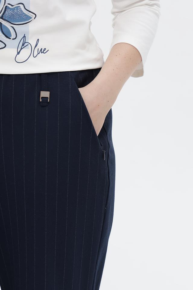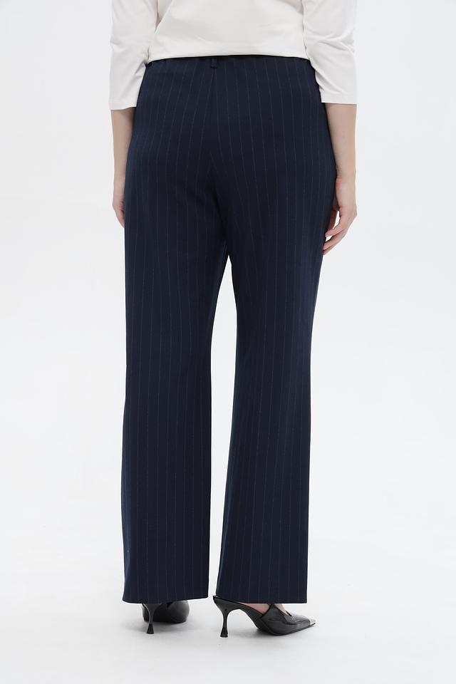 Брюки имеют прямой крой, высокую посадку и вертикальную полоску, визуально стройнящую фигуру. Застежка на молнию и пуговицу обеспечивает надежную фиксацию. Боковые и задние карманы добавляют функциональности.