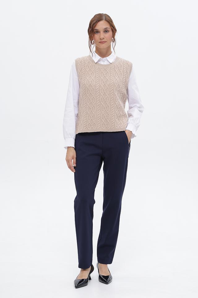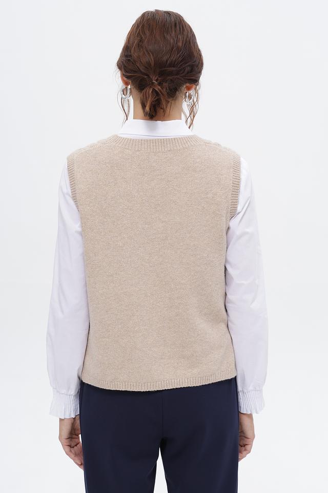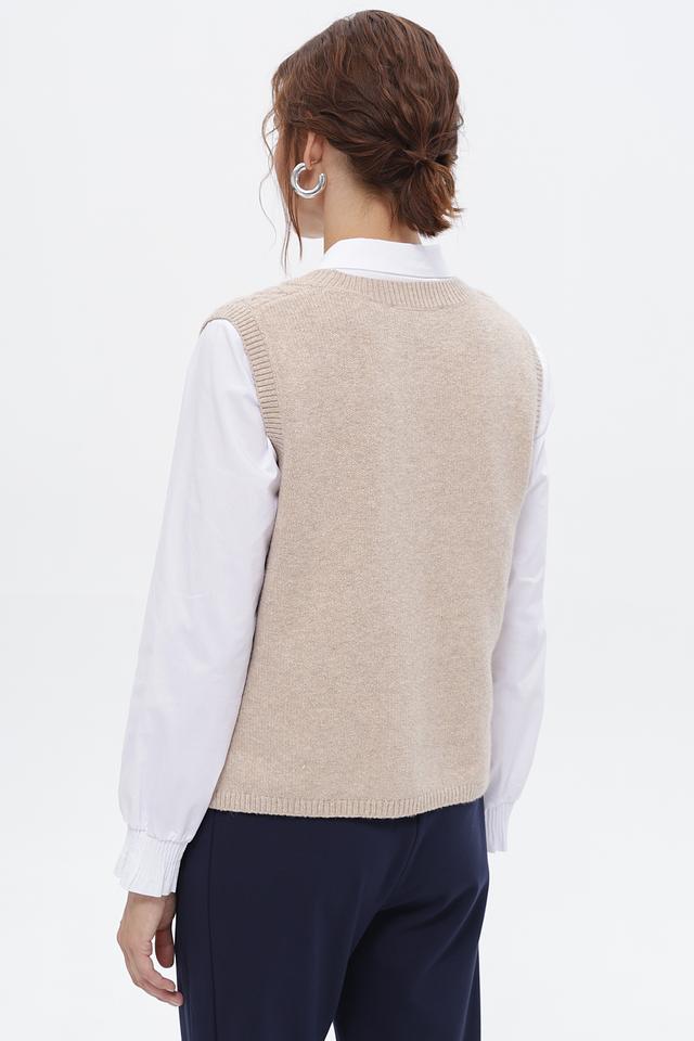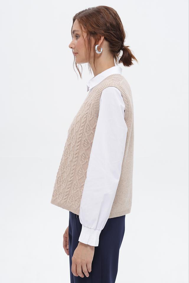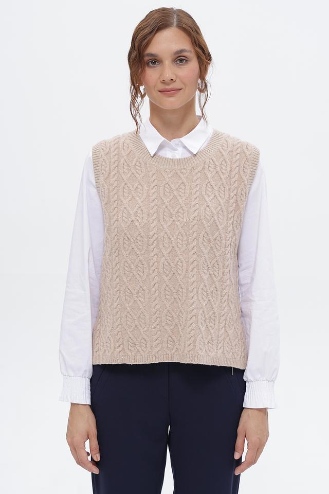 Жилет имеет бежевый цвет и украшен выразительным узором из кос, который придает ему особый шарм. Классический крой делает его универсальным и подходящим для различных стилей одежды.