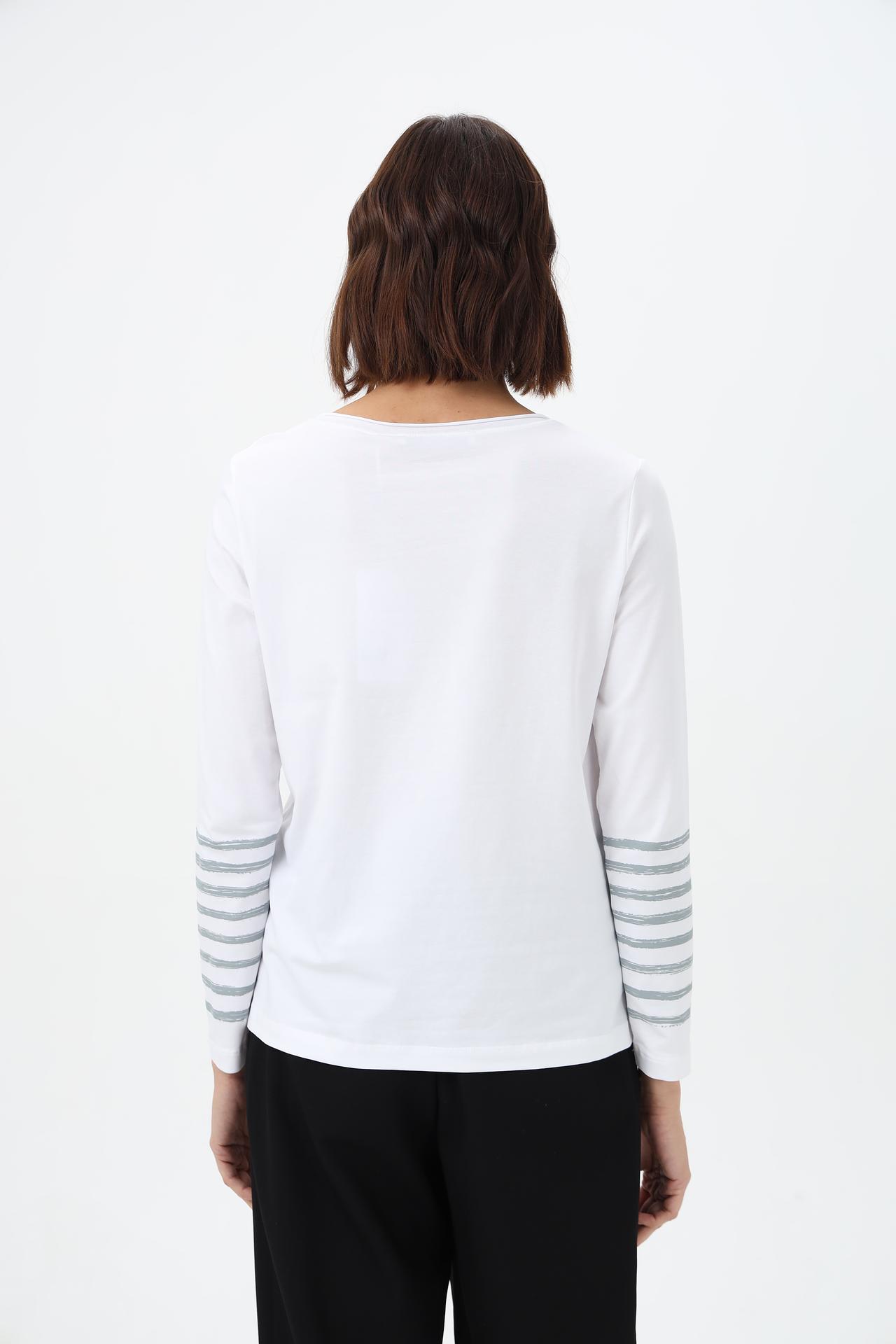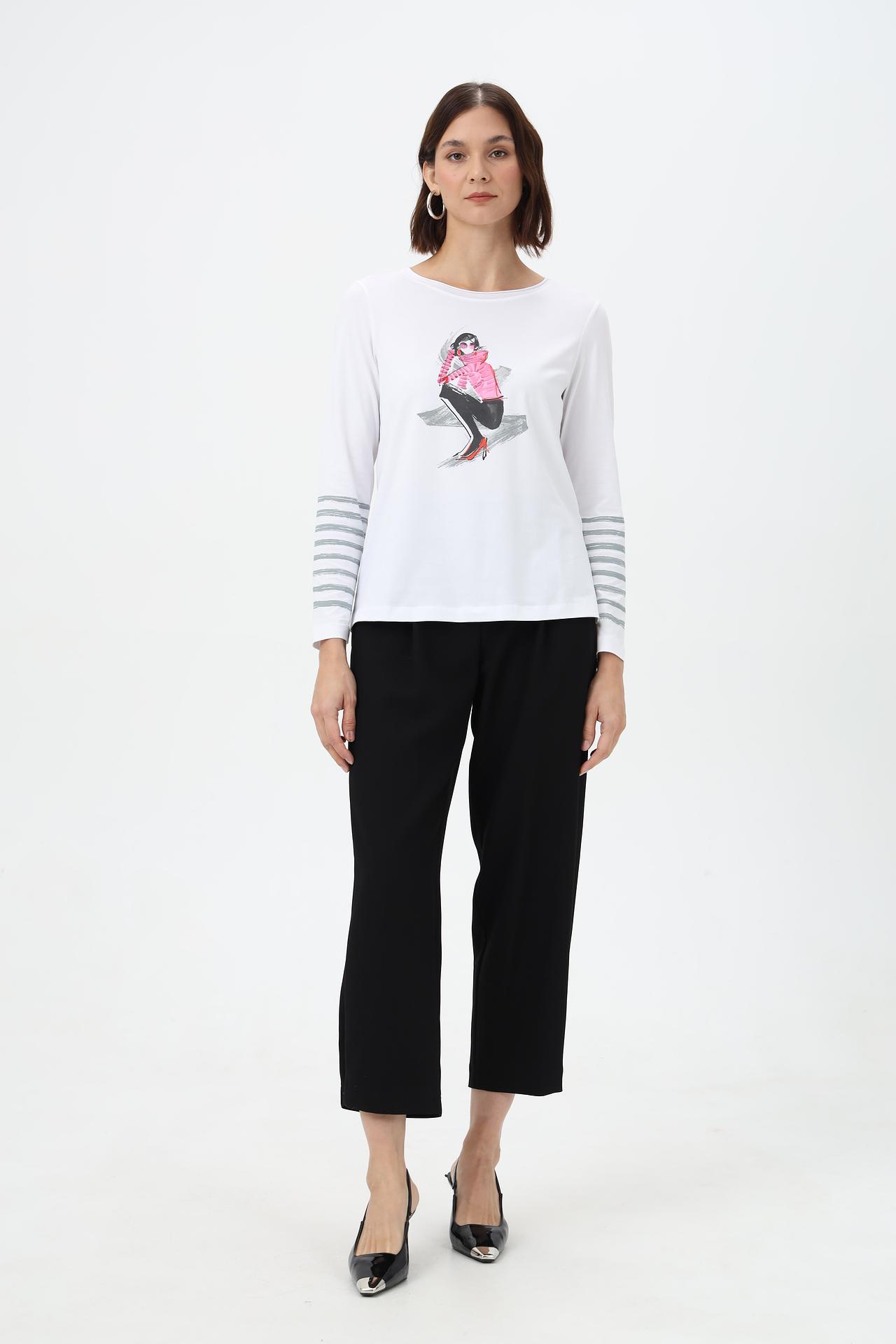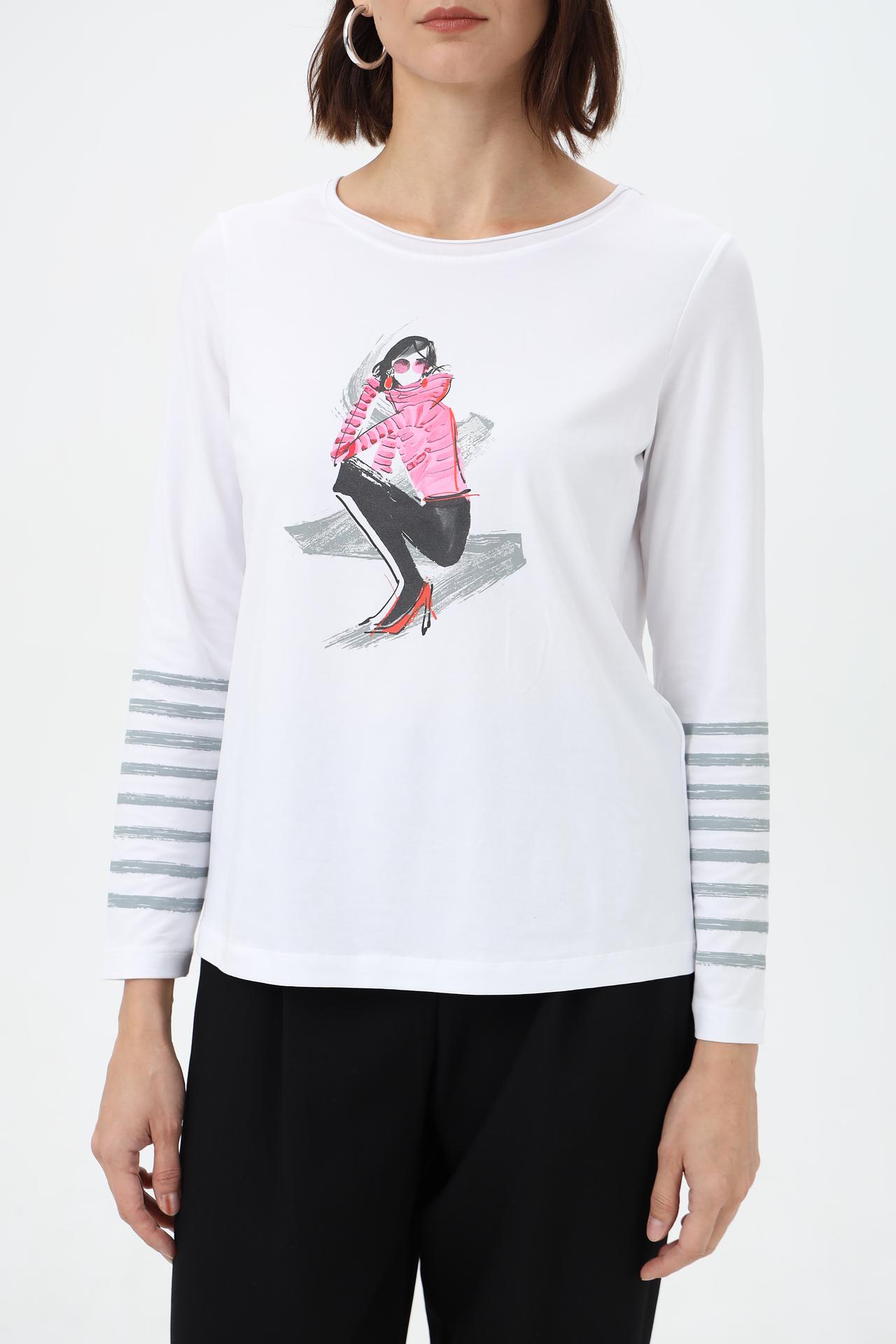 - Дизайн: Эффектный принт с изображением девушки в розовом пуховике и стильные полосатые манжеты делают эту блузу по-настоящему уникальной.