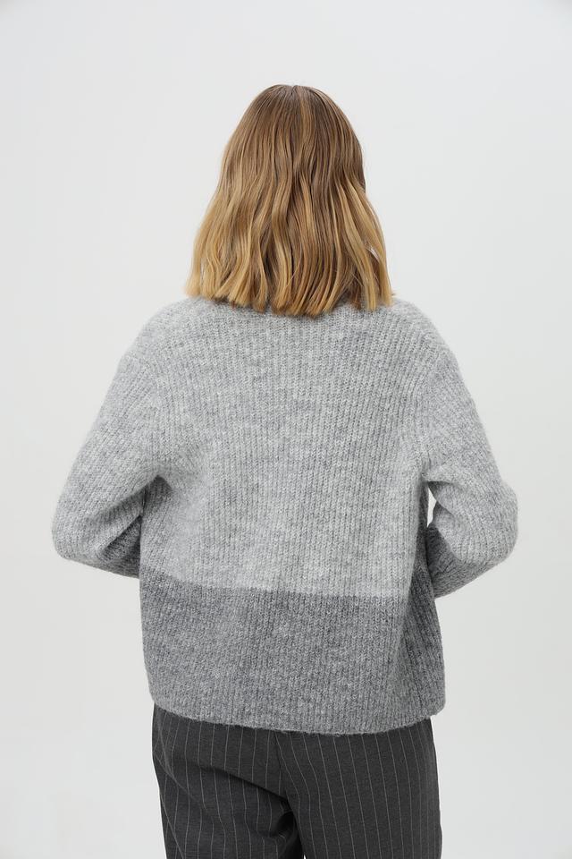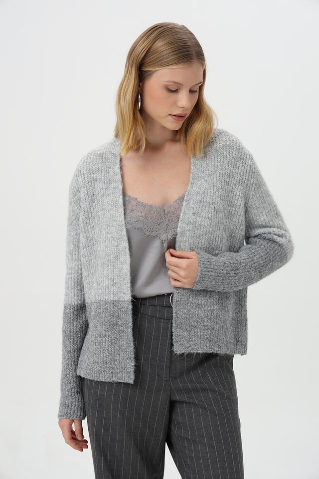 Особенностью данного жакета является его двухцветное исполнение – верхняя часть изделия выполнена в более светлом оттенке серого, а нижняя – в более насыщенном. Это создает интересный визуальный эффект и делает модель более оригинальной. Текстурный трикотаж добавляет изделию объема и фактурности.