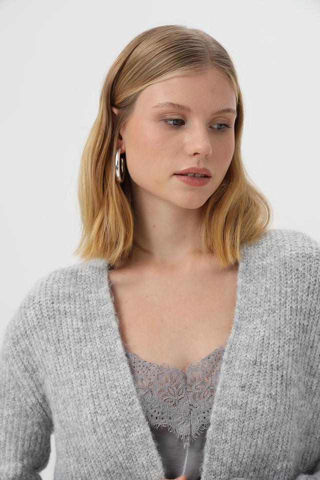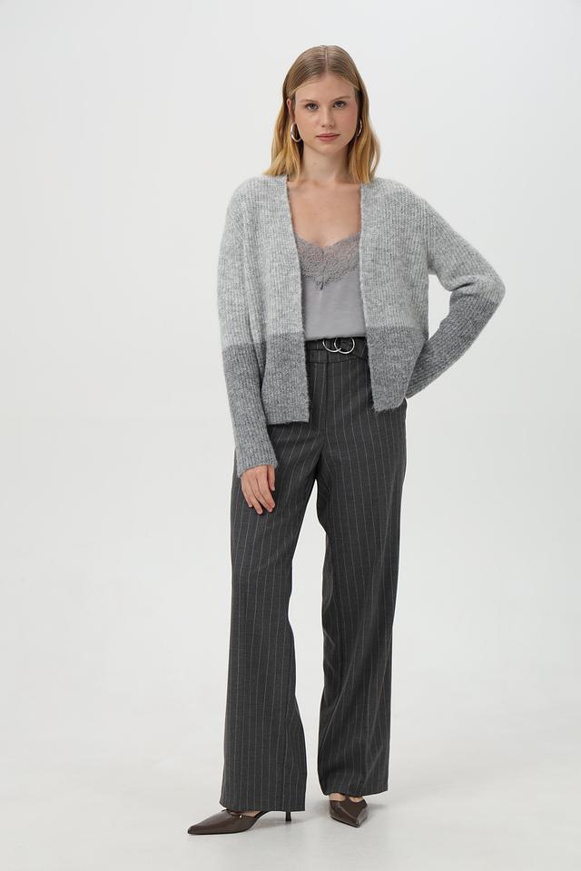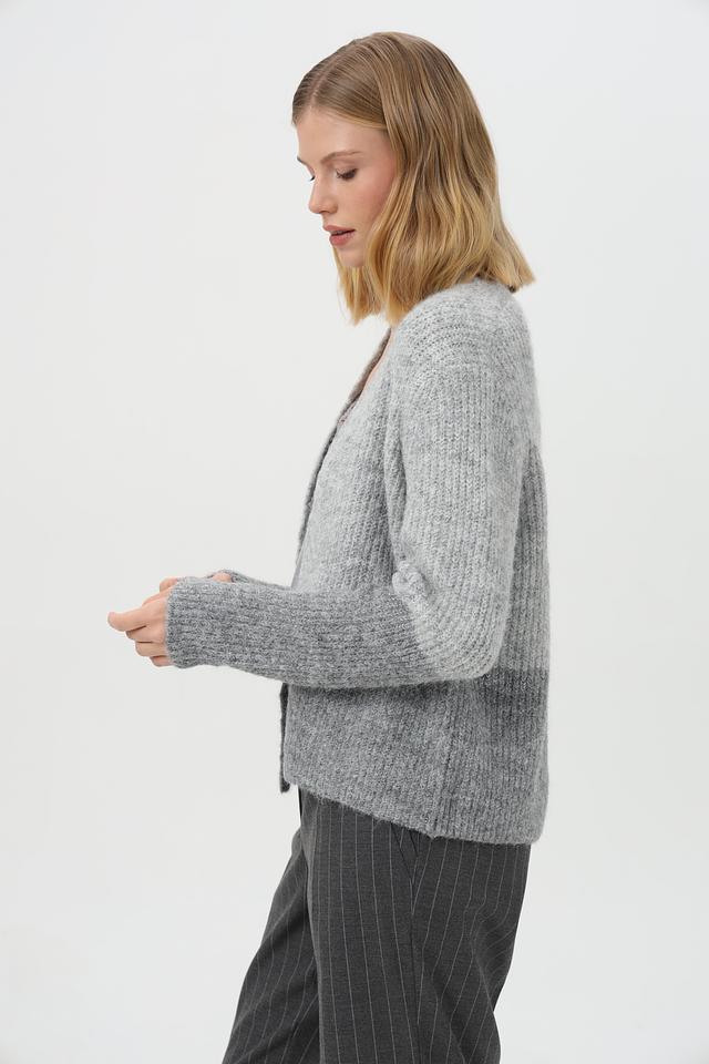 Серый жакет Bianca свободного кроя выполнен из мягкого трикотажа с добавлением шерсти и полиэстера. Отличный вариант для создания уютных образов в прохладную погоду. Состав: полиэстер 74%, полиамид 18%, шерсть 6%, эластан 1%, метализ.нить 1%