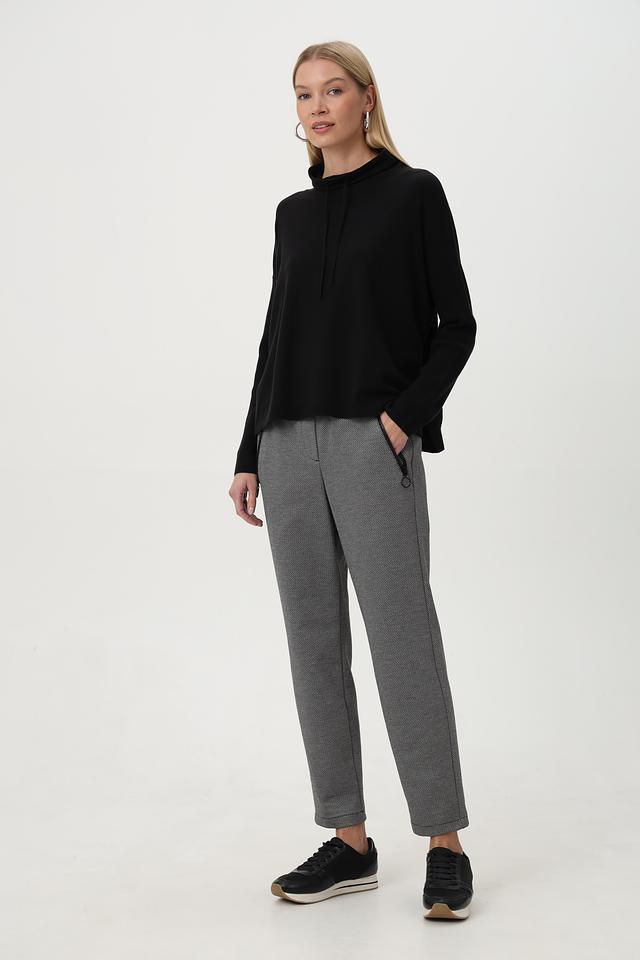 Брюки имеют завышенную талию и слегка зауженный крой, который визуально удлиняет ноги. Эластичный пояс дополнен шнурком для регулировки посадки. Боковые карманы обеспечивают практичность.
