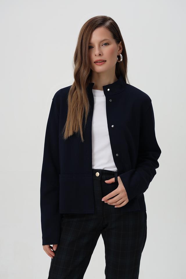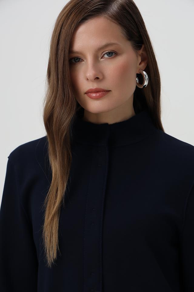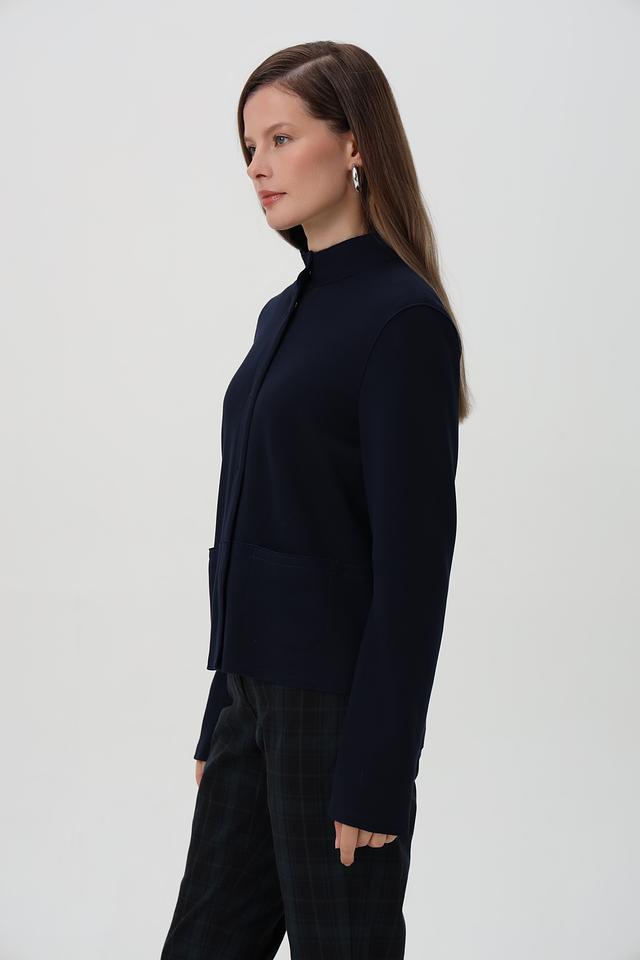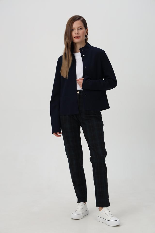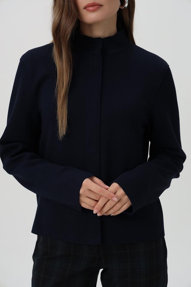 Жакет имеет приталенный силуэт, который подчеркивает фигуру, воротник-стойку и застегивается на пуговицы по всей длине.