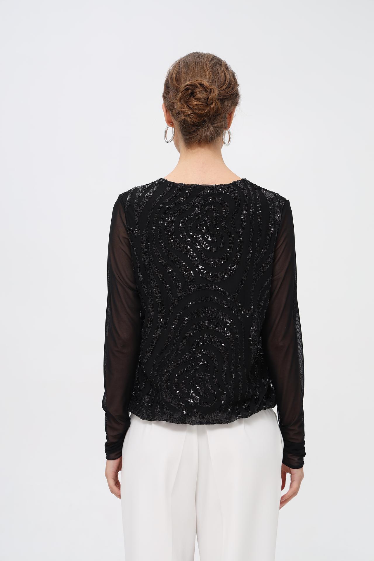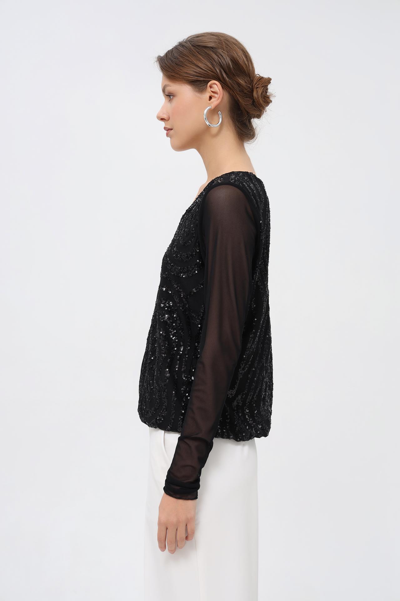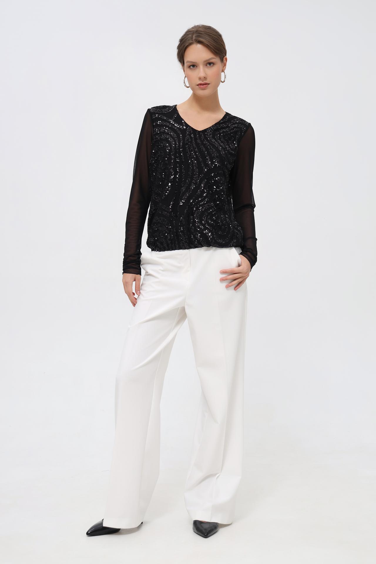 Элегантная блуза Bianca – идеальный выбор для создания эффектного образа. Модель выполнена в классическом чёрном цвете и украшена мерцающими пайетками, расположенными в виде оригинального узора. Полупрозрачные рукава из лёгкой ткани добавляют образу изысканности и воздушности.