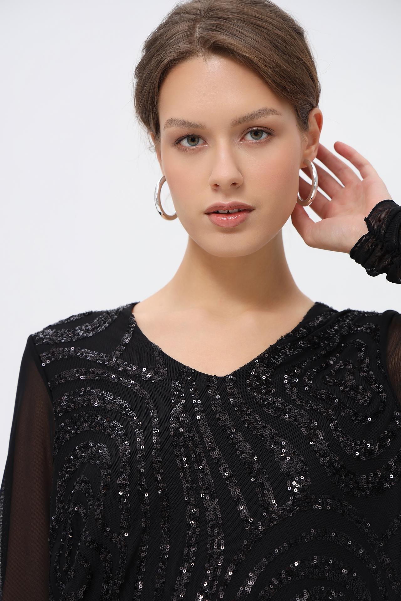 - Дизайн. Блуза декорирована сверкающими пайетками, создающими неповторимый акцент. V-образный вырез и приталенный силуэт выгодно подчеркивают достоинства фигуры.
