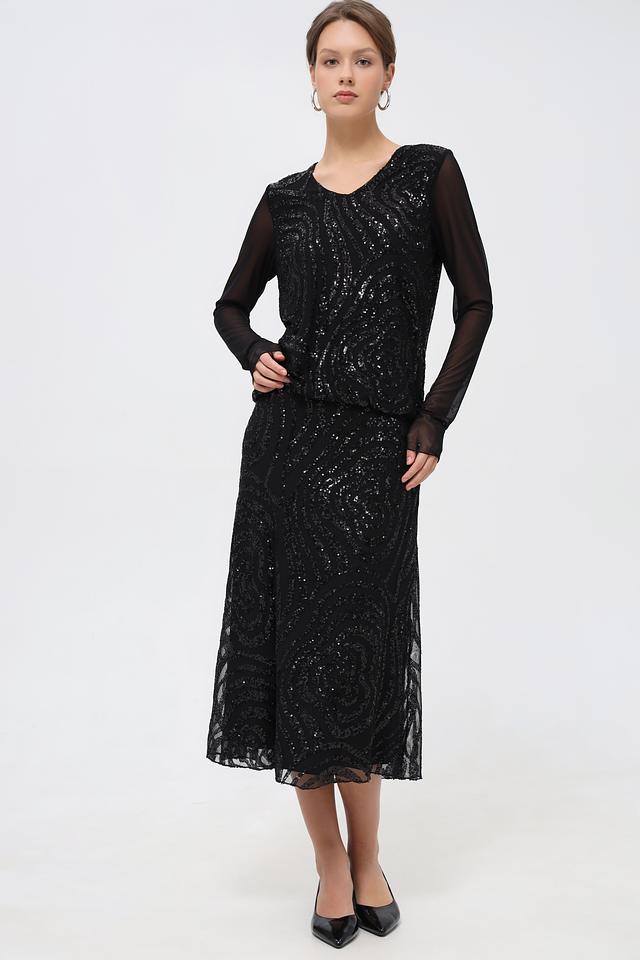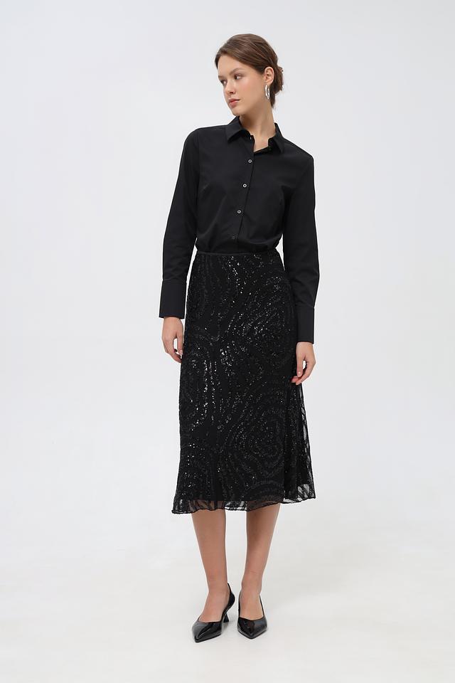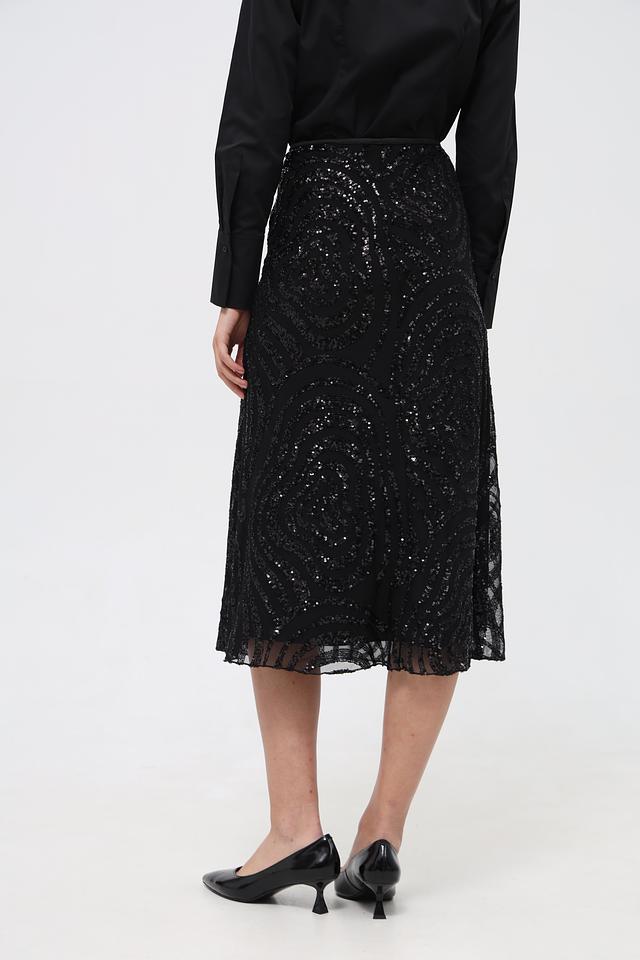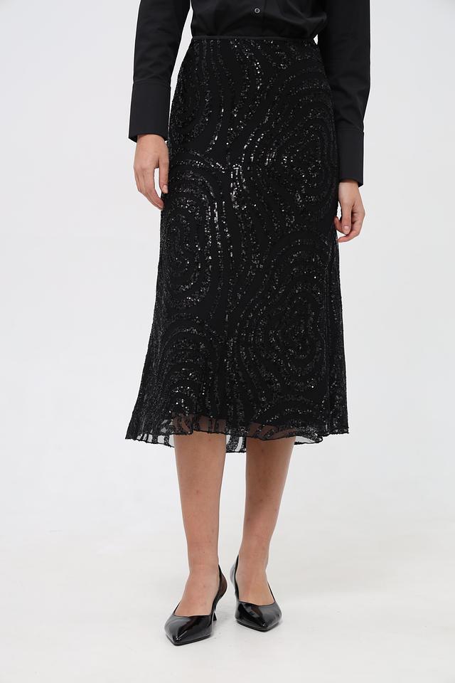 Эта изысканная юбка от Bianca станет прекрасным дополнением к вашему гардеробу. Модель выполнена в чёрном цвете и полностью покрыта узором из мерцающих пайеток, создающих эффектный и запоминающийся образ.