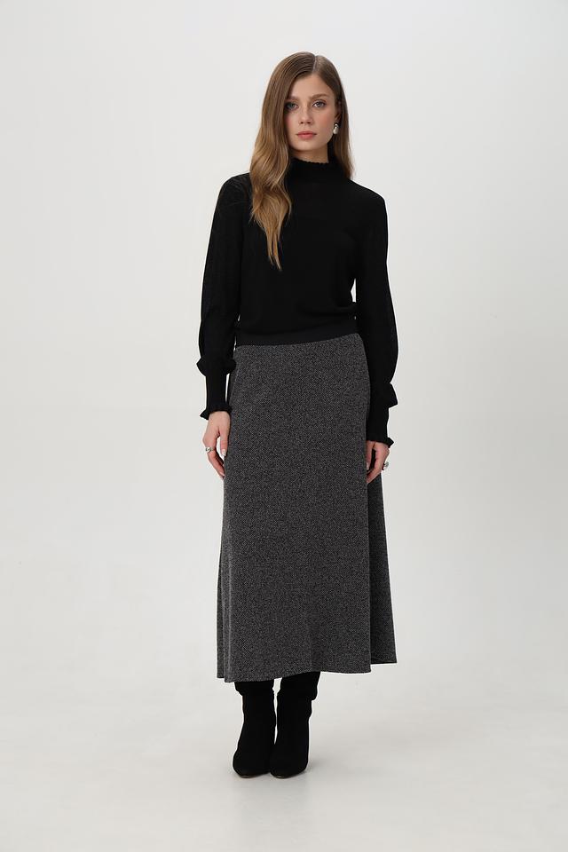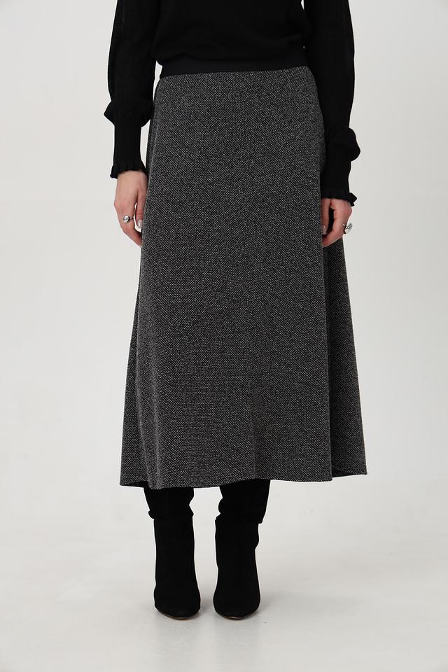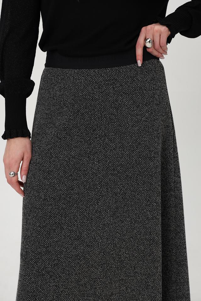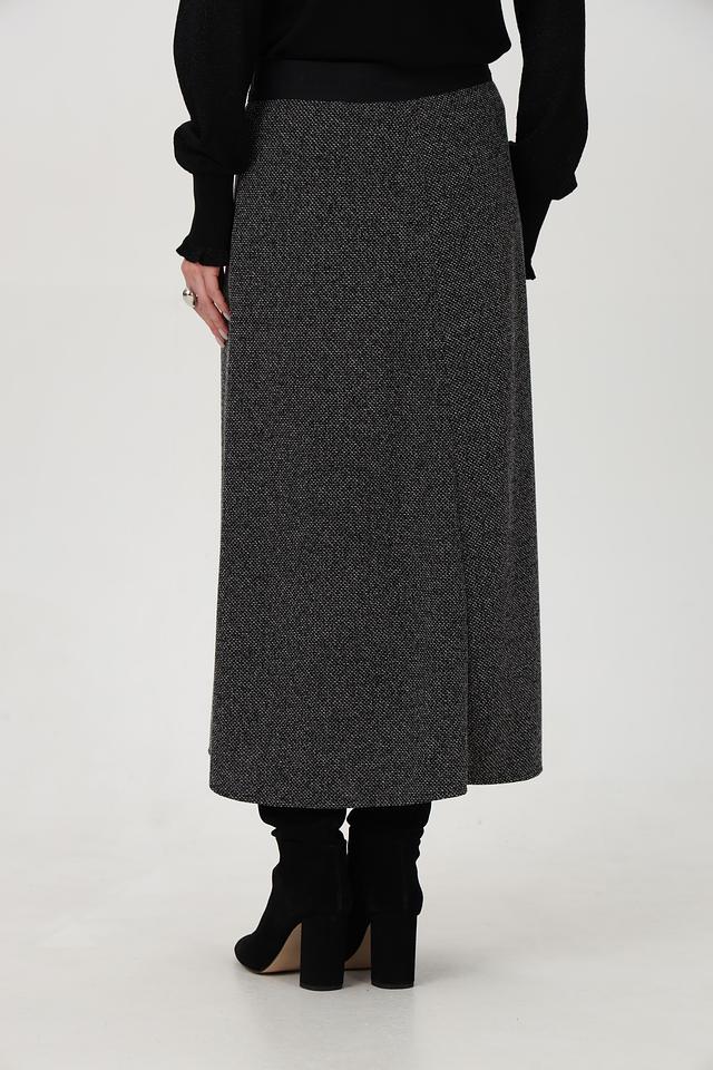 Основной цвет юбки – графит, а её поверхность покрыта мелким узором, который придает ей особый шарм и текстуру. Эластичный пояс обеспечивает комфортную посадку по фигуре.