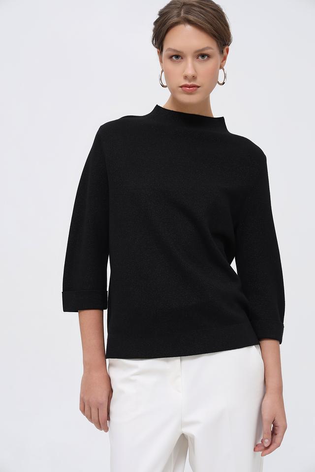 Чёрный пуловер Bianca с рукавом 3/4 – элегантная модель из вискозы, сочетающая комфорт и стиль. Полукруглый вырез горловины и лаконичный крой делают этот пуловер универсальным элементом гардероба. Состав: вискоза 80%, метализ.нить 20%