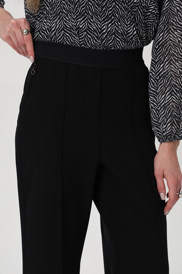 Пояс на эластичной резинке дополнен завязками, позволяющими регулировать посадку по фигуре. Брюки имеют две боковые карманы. Данная модель идеально подойдет как для создания деловых образов, так и для повседневной носки.
