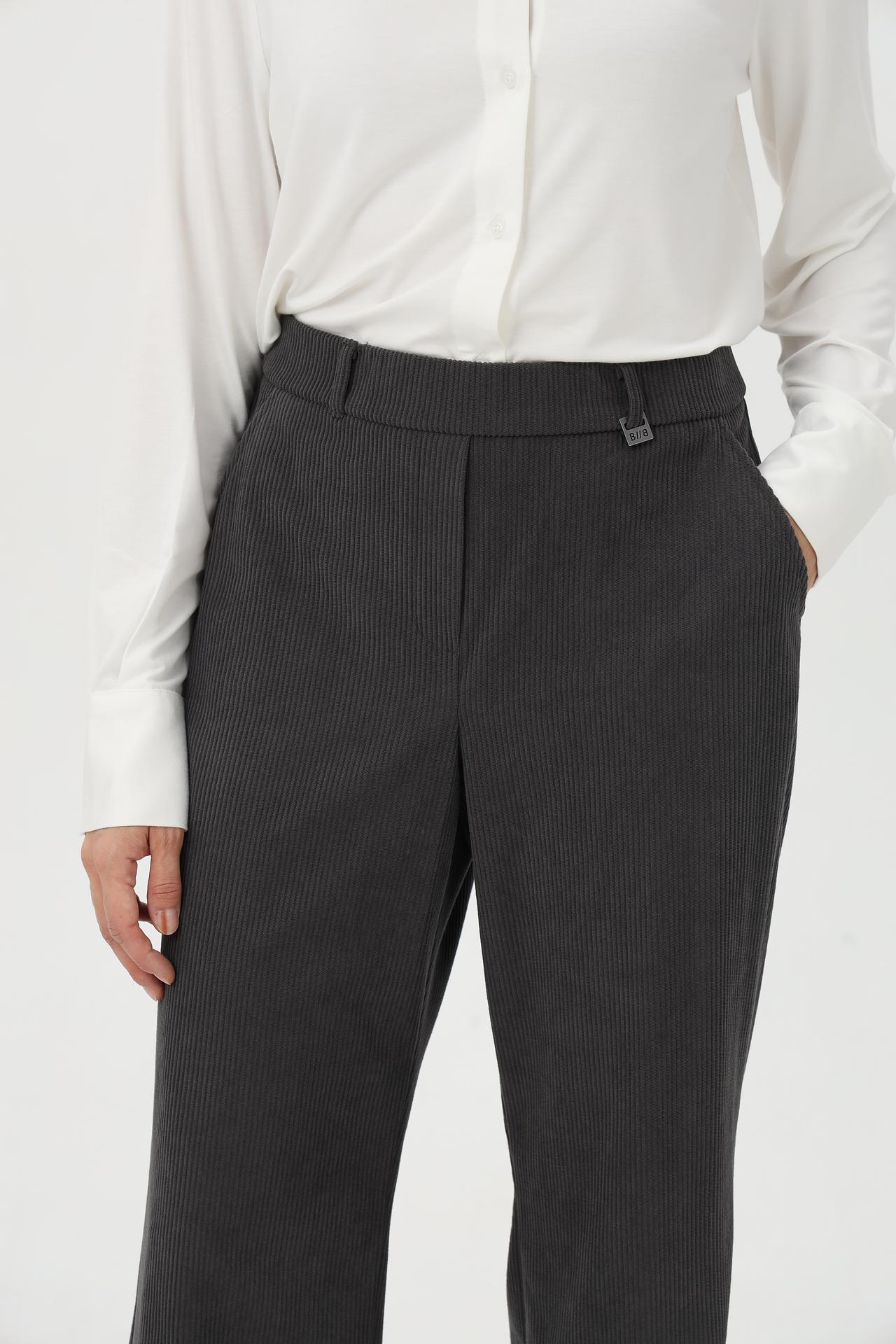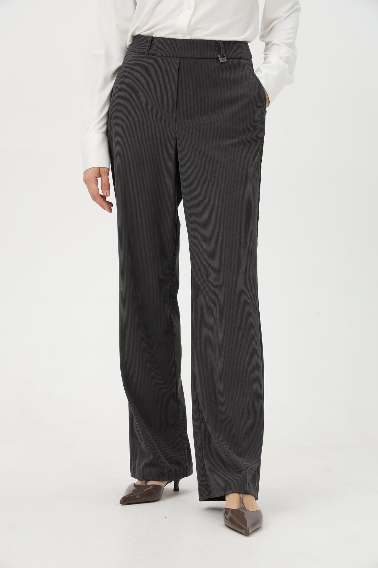 - Дизайн: Классический прямой крой с актуальной фактурой в мелкую полоску. Детали: пояс с петлями для ремня, застежка-молния и пуговица, боковые карманы.