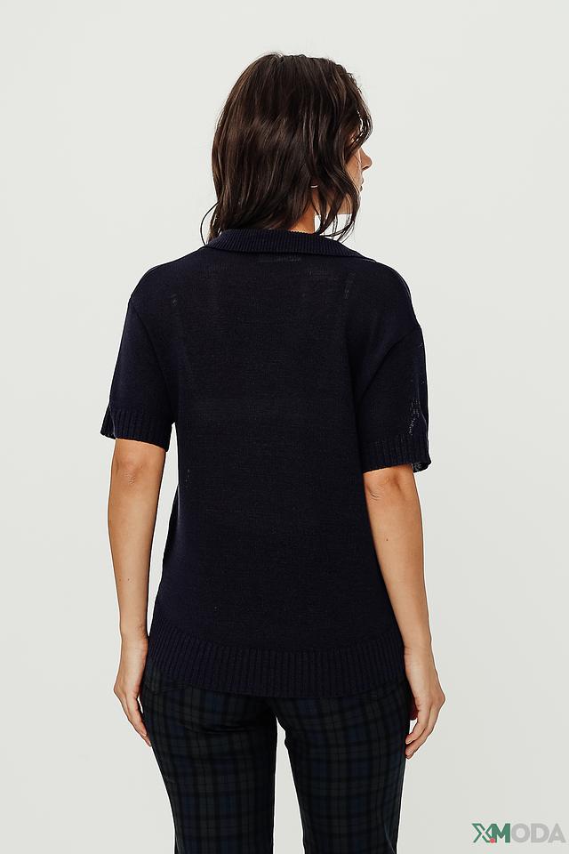 Стильный пуловер Bianca тёмно-синего цвета с короткими рукавами и V-образным вырезом. Модель выполнена из мягкого трикотажа с воротником-стойкой, что придает ей элегантный вид. Состав: вискоза 65%, полиамид 35%