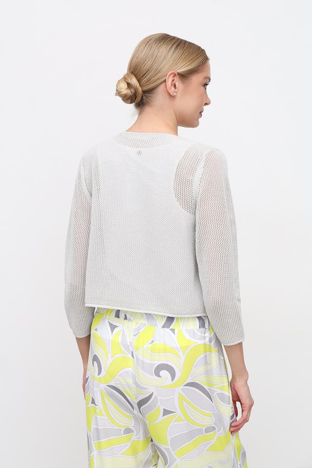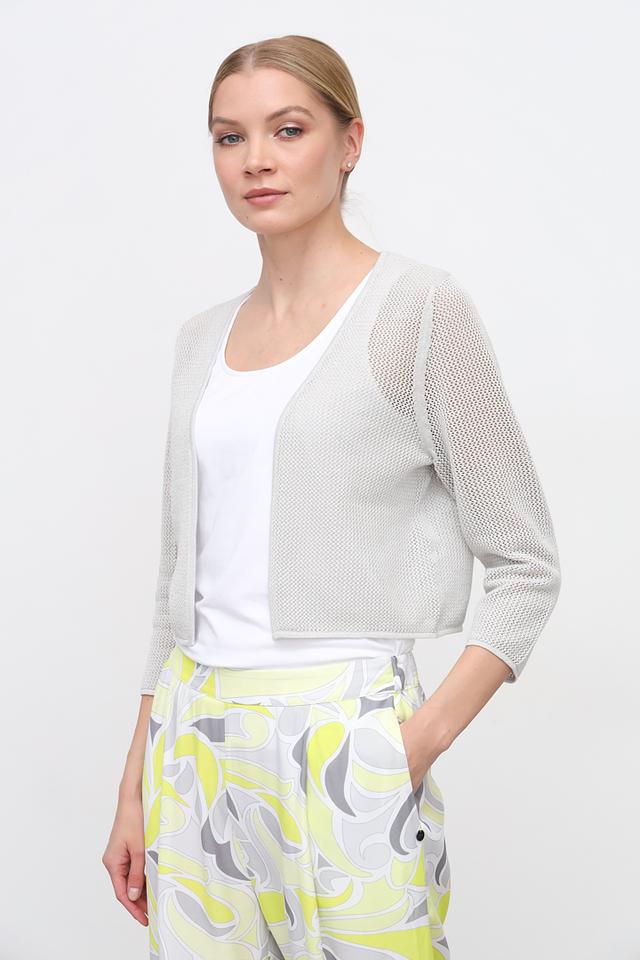 Жакет имеет укороченный крой и рукава длиной 3/4, что делает его идеальным для создания модных и лёгких образов. Открытая конструкция с сетчатым полотном добавляет оригинальности и воздушности.
