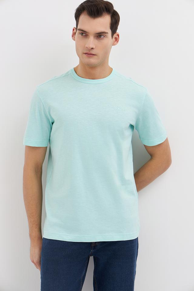 Цвет футболки – нежный мятный, который легко сочетается с различными элементами гардероба. На груди расположена небольшая вышивка с логотипом бренда, добавляющая изысканности. Круглый вырез горловины и короткие рукава делают эту футболку идеальной для теплой погоды.