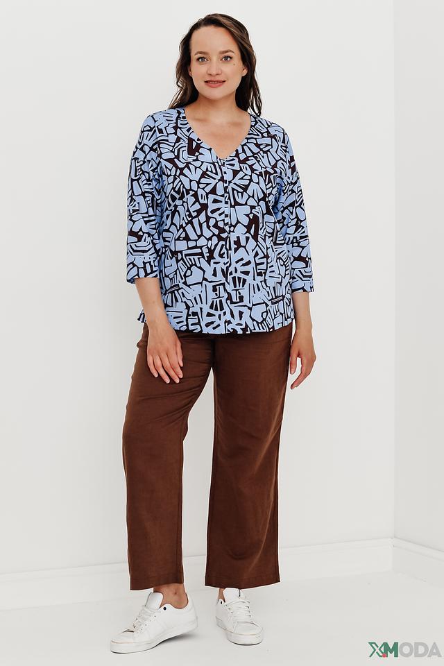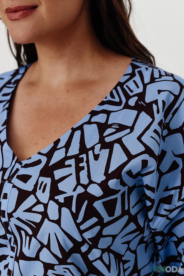 Блуза имеет свободный крой, который не сковывает движений, и V-образный вырез, который визуально удлиняет шею. Главная особенность этой модели – яркий и необычный принт в голубых и черных тонах, который добавит изюминку вашему образу.