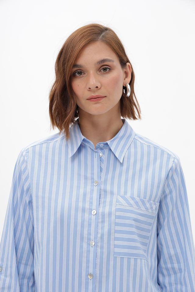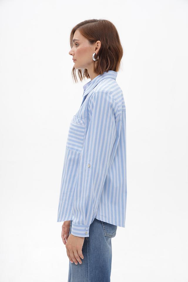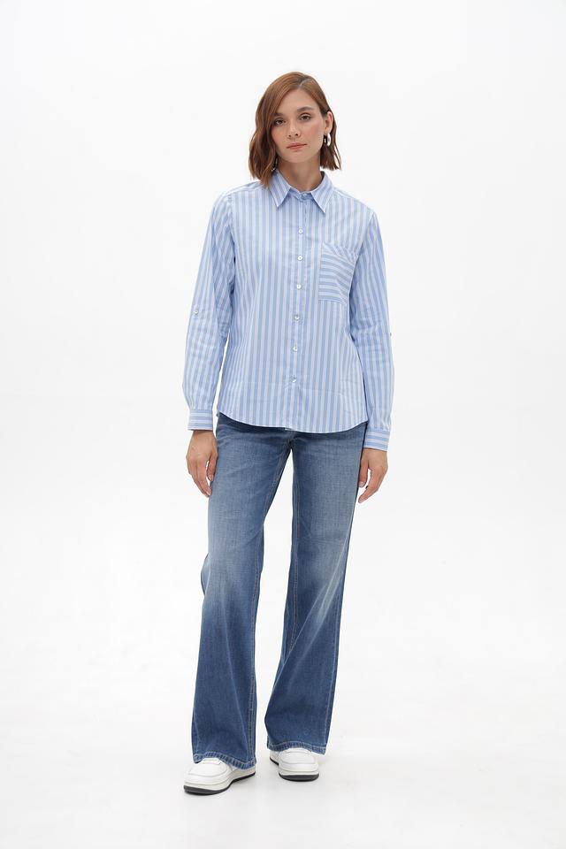 Женская блузка Bianca голубого цвета в белоснежную полоску — идеальный выбор для создания стильного и комфортного образа. Модель выполнена из хлопкового трикотажа с добавлением полиамида и эластана, что обеспечивает удобную посадку и лёгкость в уходе. Состав: хлопок 74%, полиамид 22%, эластан 4%