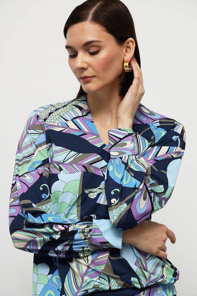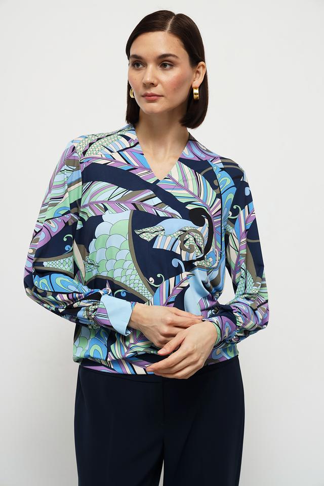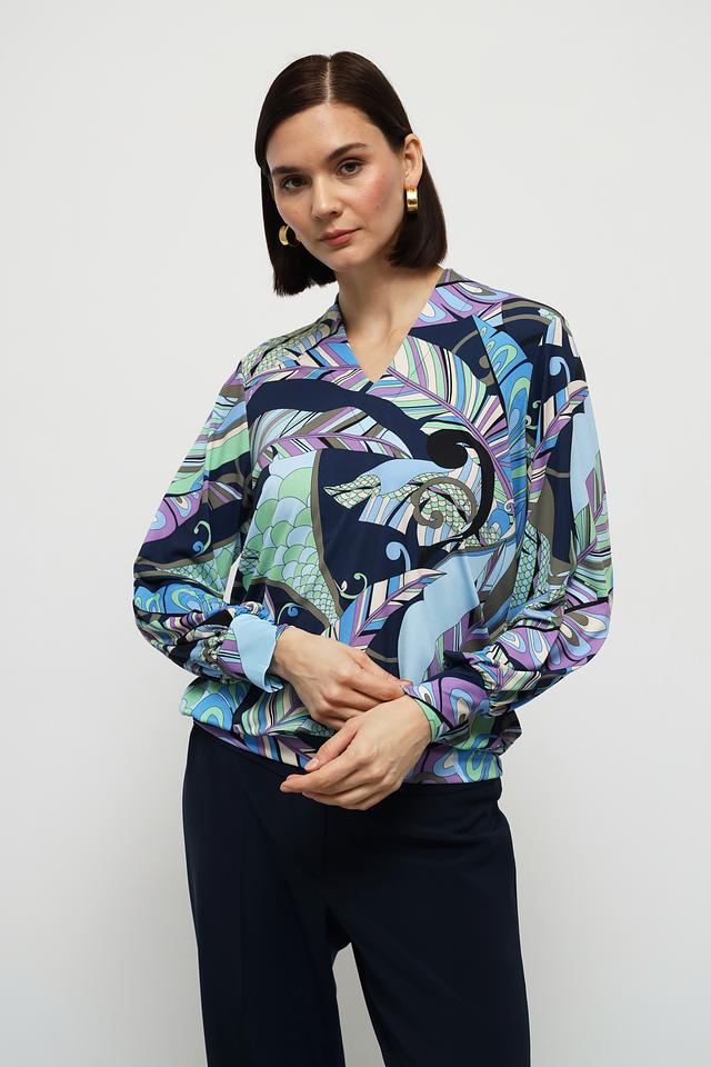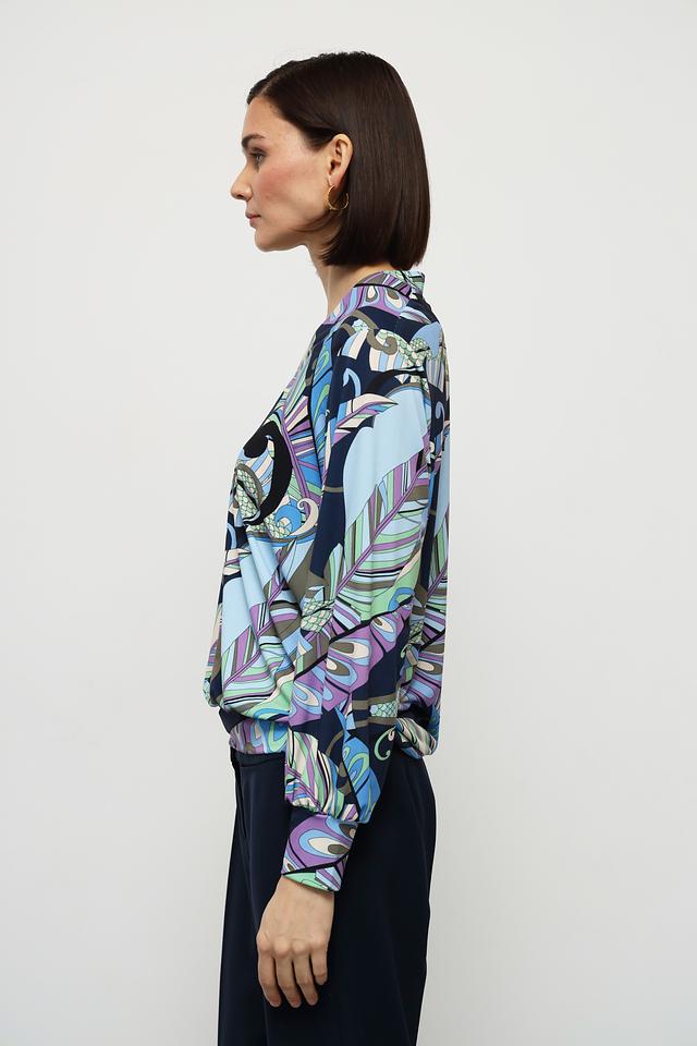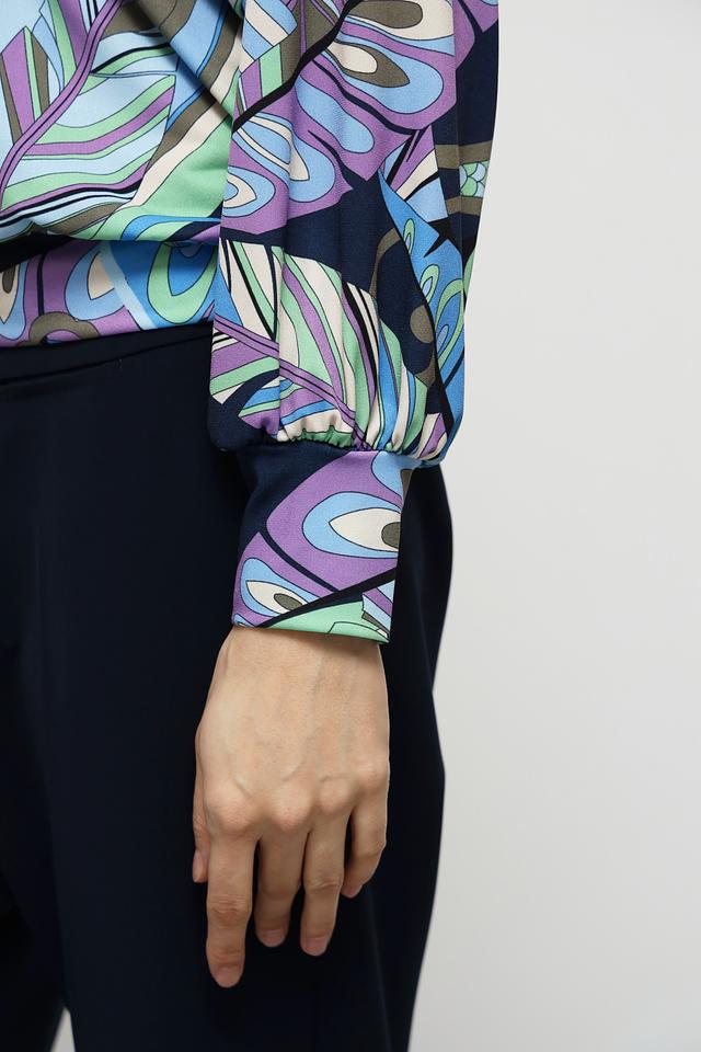 Блуза имеет свободный крой и длинные рукава, что делает её универсальной для различных случаев. V-образный вырез горловины добавляет изящества, а оригинальный принт с абстрактными мотивами делает эту модель уникальной.