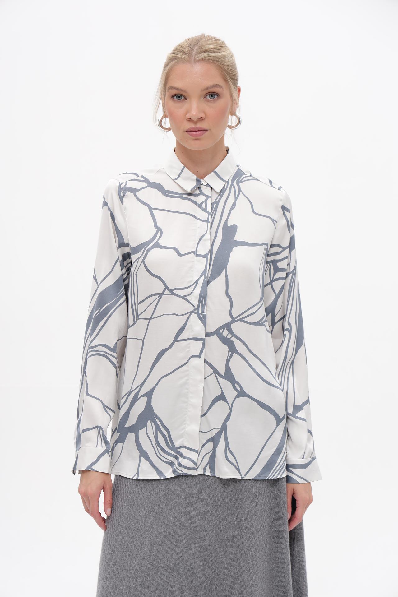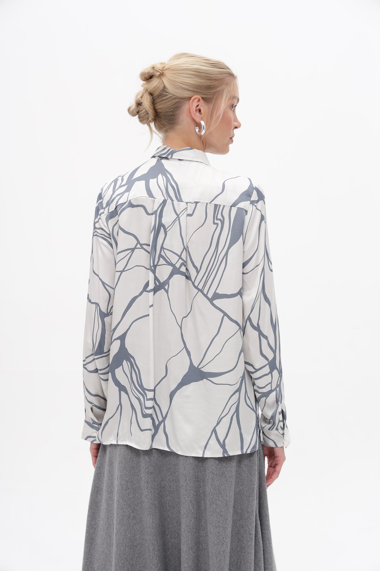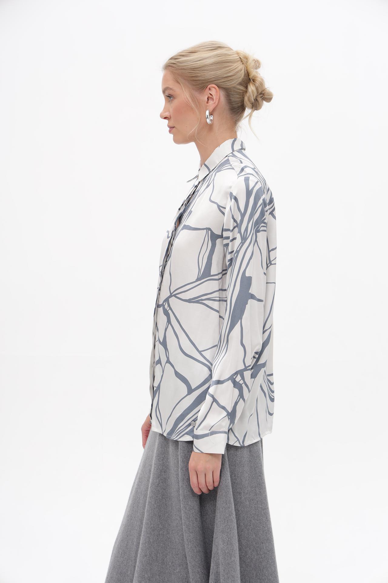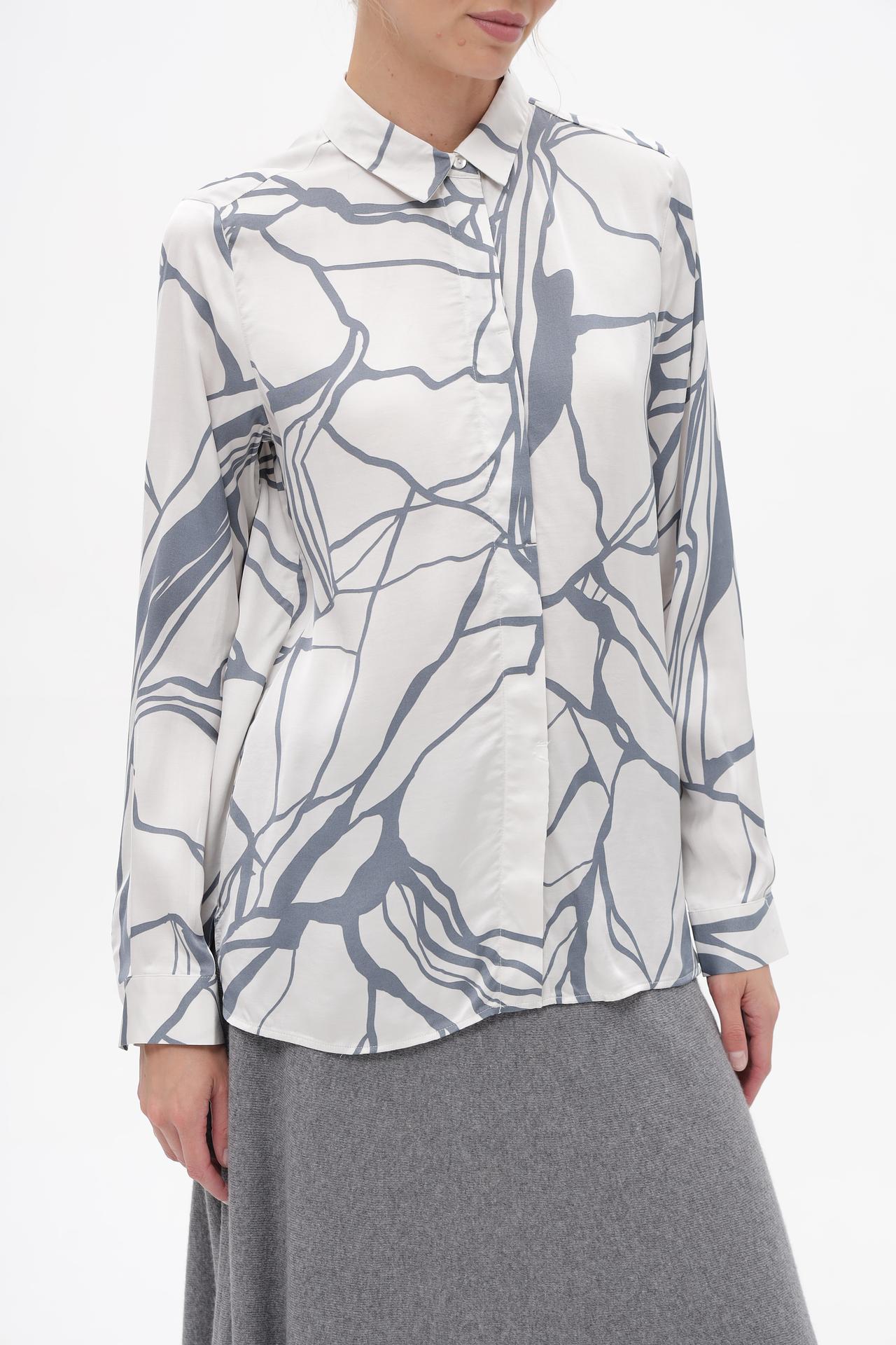 Дизайн: Белый с принтом. Универсальный белый цвет является основой для смелых принтов, которые добавляют блузе индивидуальности и делают ее акцентным элементом любого наряда. Принт выполнен с высокой точностью, не выцветает и не стирается.