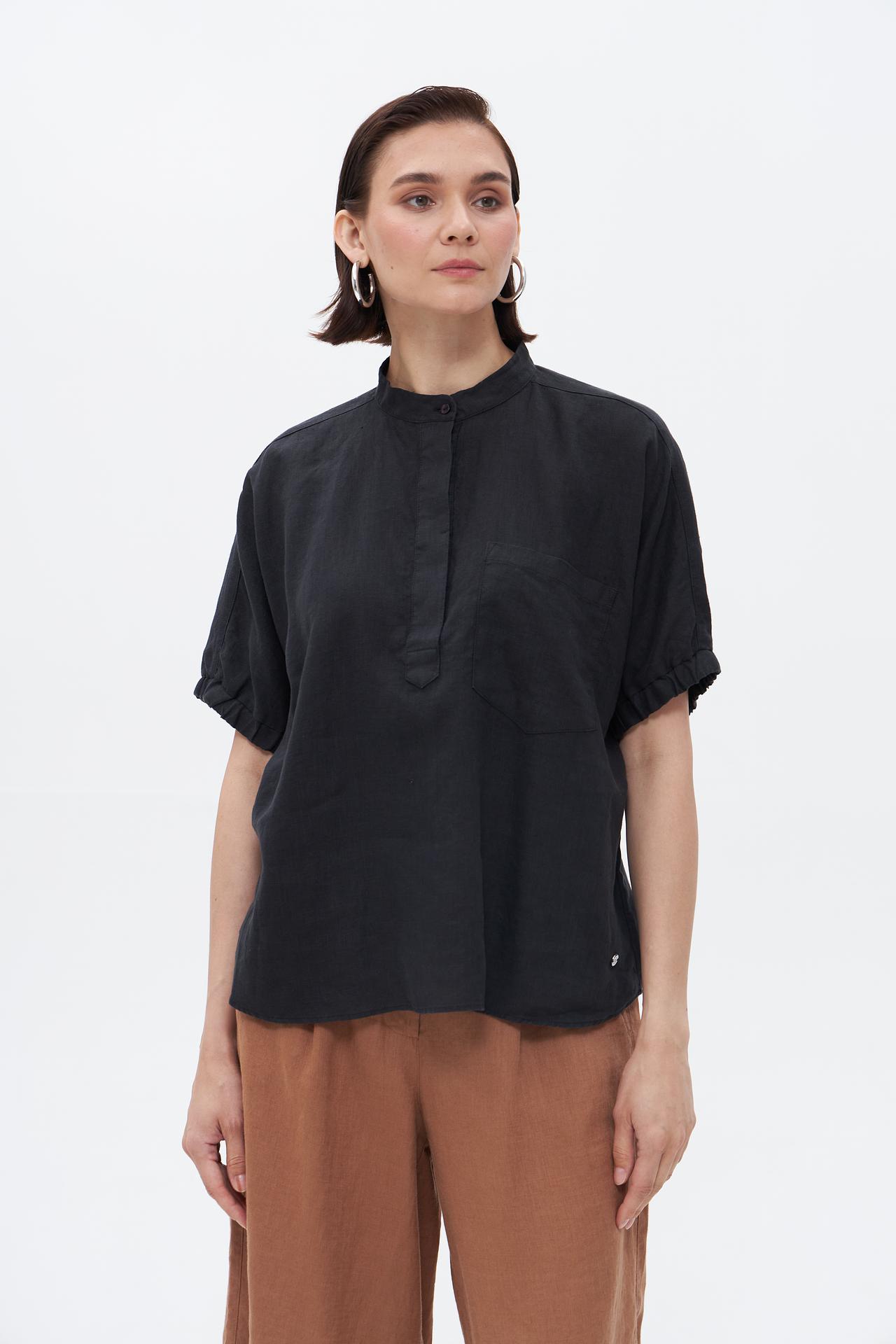 - Дизайн: Блуза выполнена в лаконичном дизайне с воротником-стойкой и планкой на пуговицах. Нагрудный карман добавляет функциональности и завершает образ.