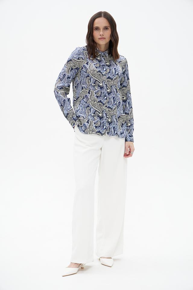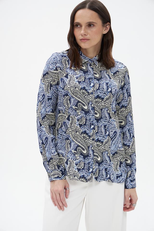 Блузка имеет классический силуэт с длинными рукавами и воротником-стойкой. Главной особенностью модели является яркий и запоминающийся узор пейсли, выполненный в синих, бежевых и голубых тонах. Этот принт добавляет блузке изысканности и оригинальности.