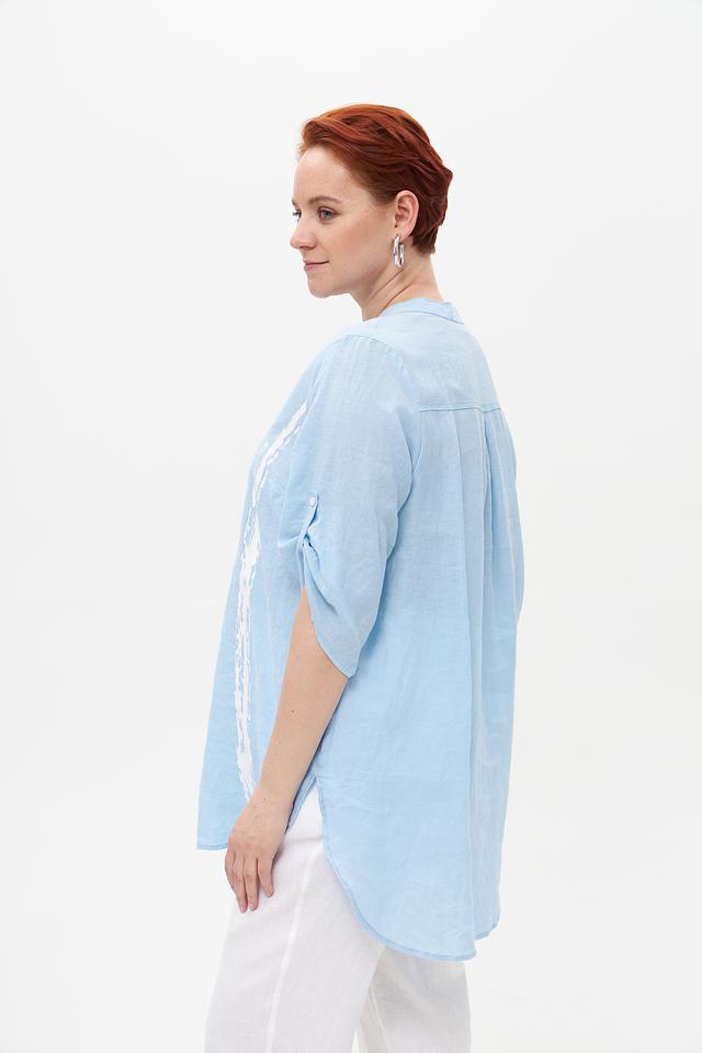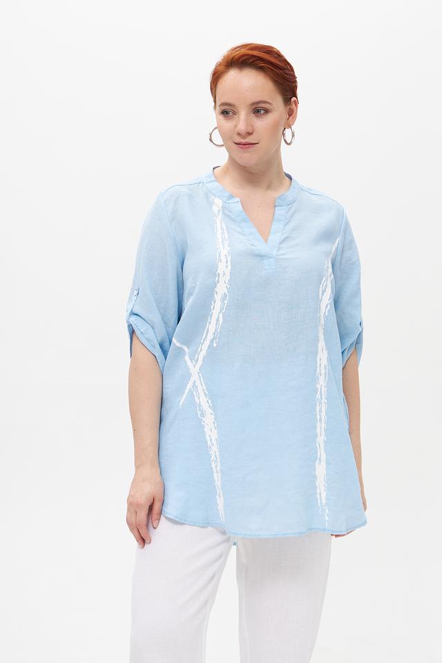 Голубая блузка от Doris Streich из 100% льна с оригинальным принтом. Лёгкий и дышащий материал обеспечивает комфорт в жаркую погоду. Идеальный выбор для создания стильного и непринуждённого образа. Состав: лен 100%