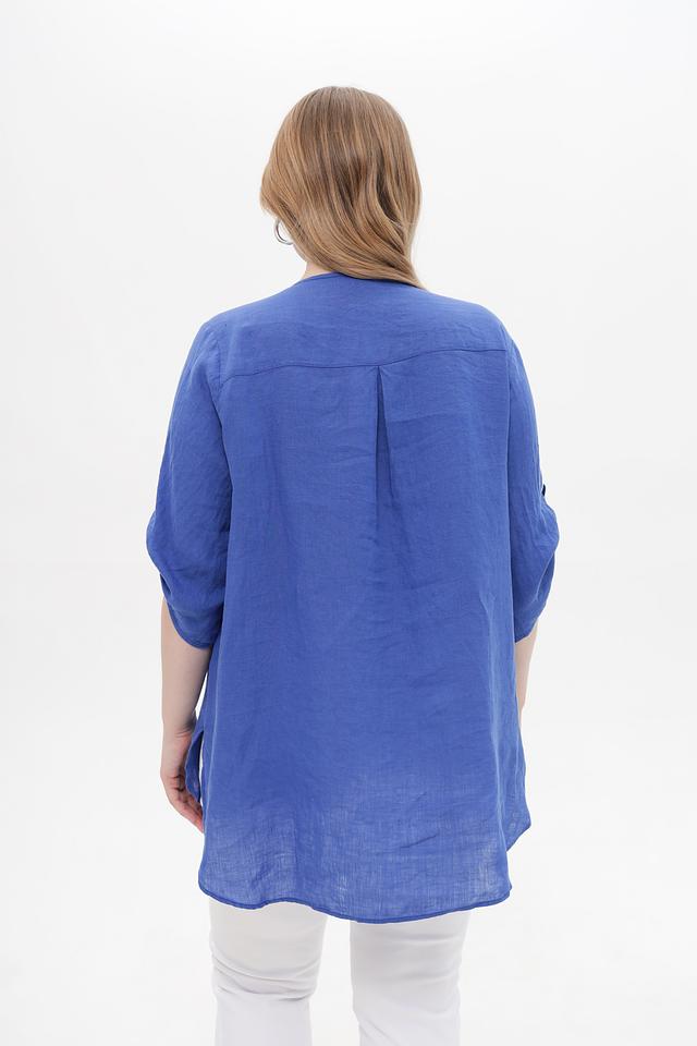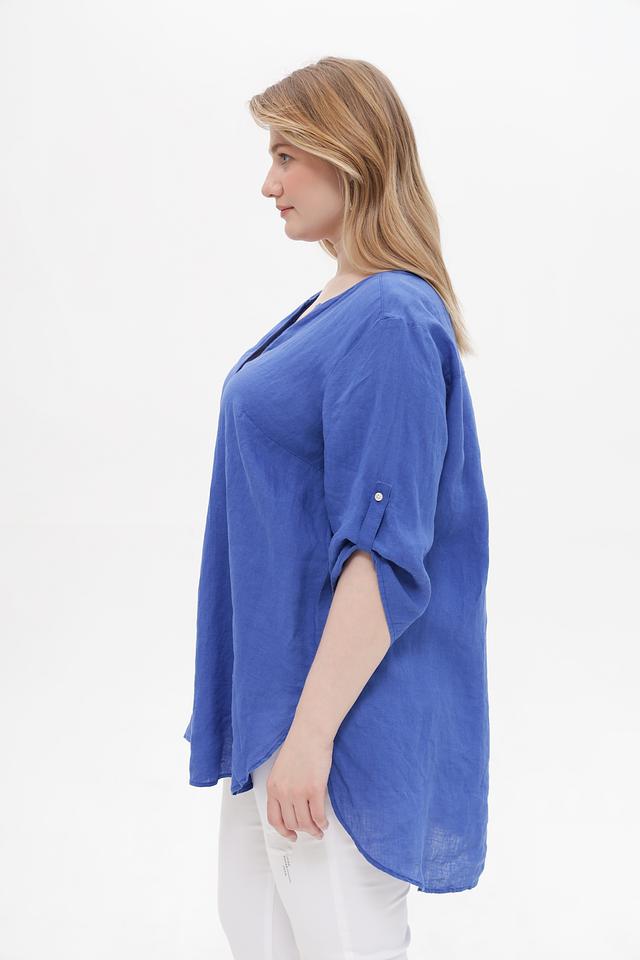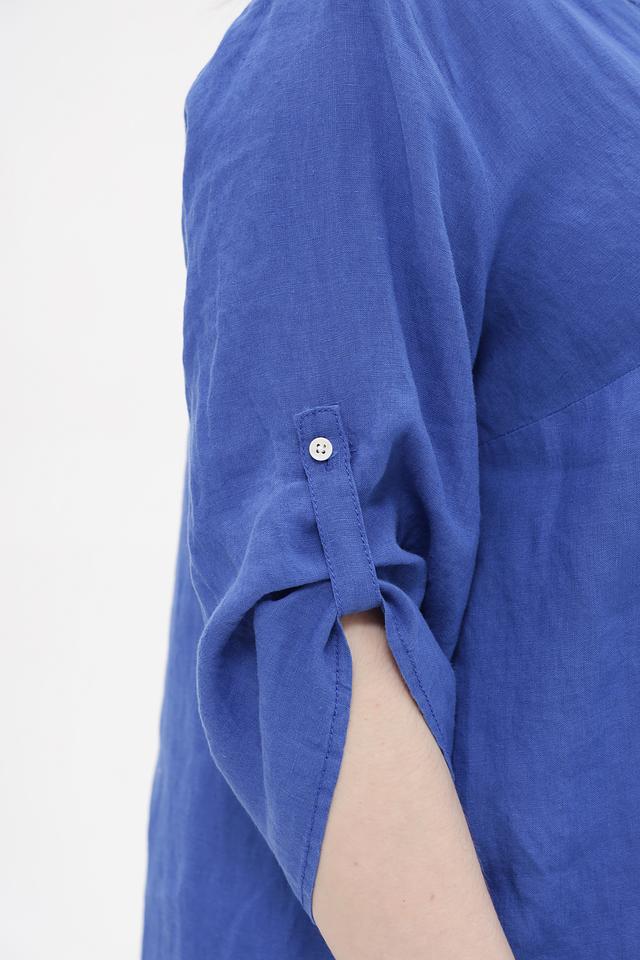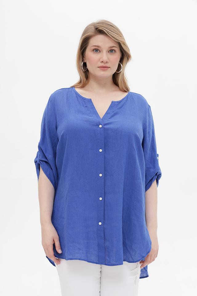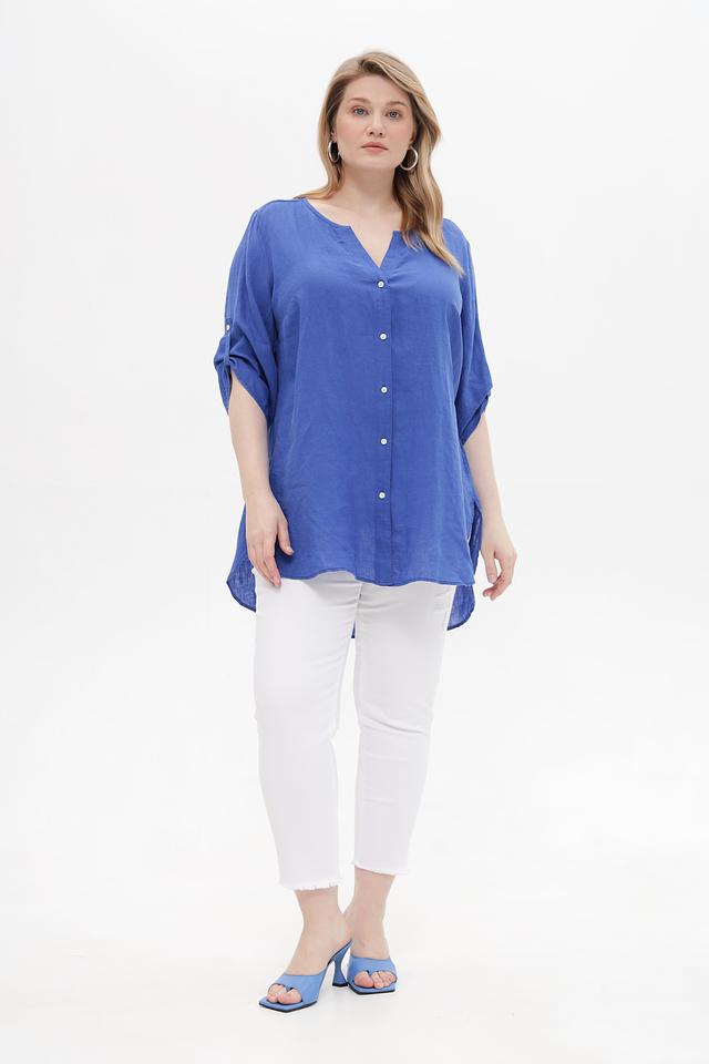 Блузка имеет свободный крой, который обеспечивает комфорт и свободу движений. V-образный вырез горловины и застёжка на пуговицы придают модели классический вид. Рукава 3/4 с небольшими складками и пуговицами добавляют изысканности.