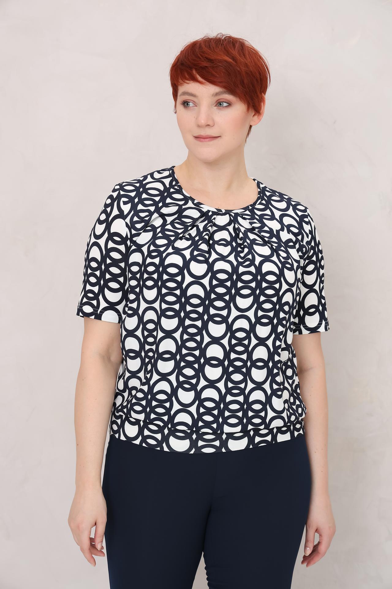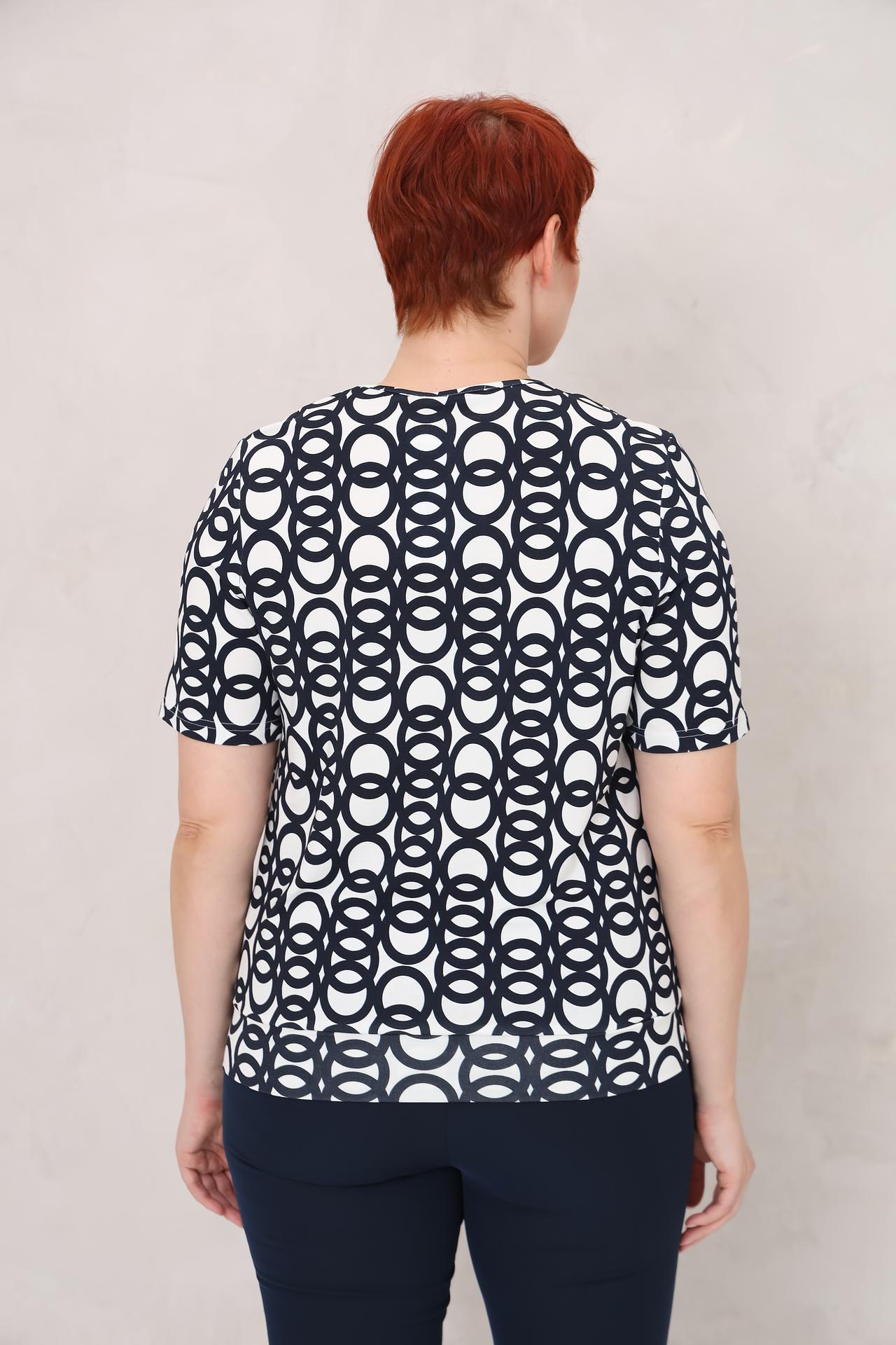 - Стильный дизайн: Модная блузка с интересным принтом геометрических кругов.