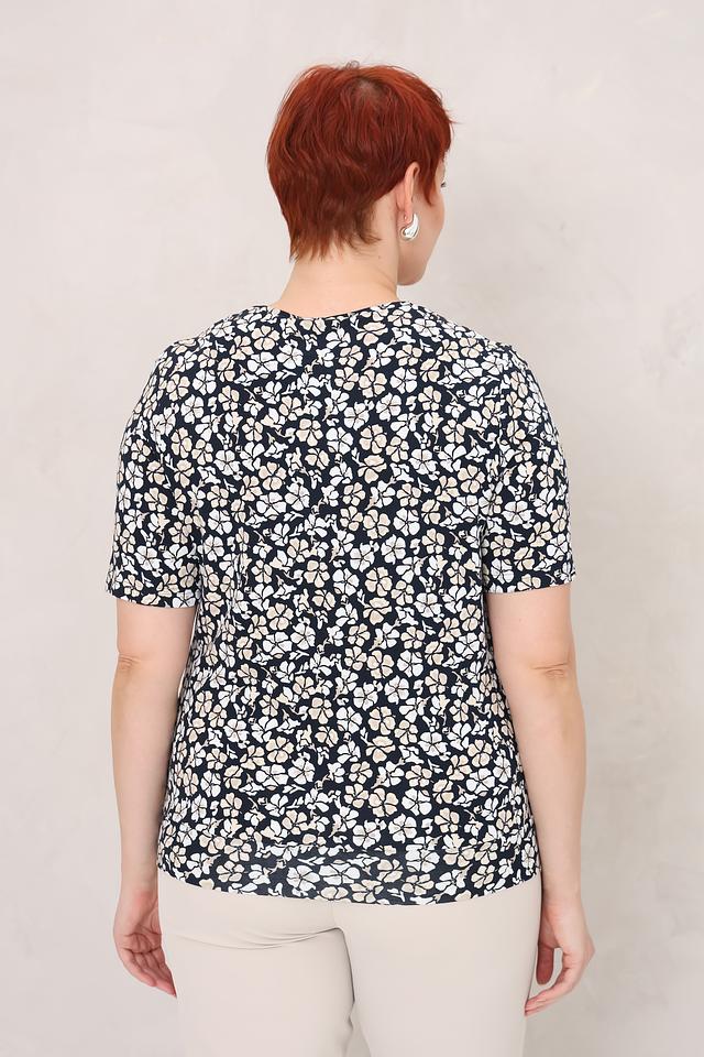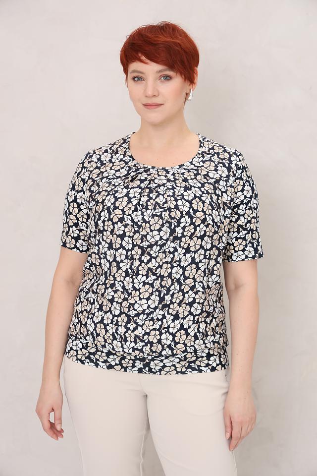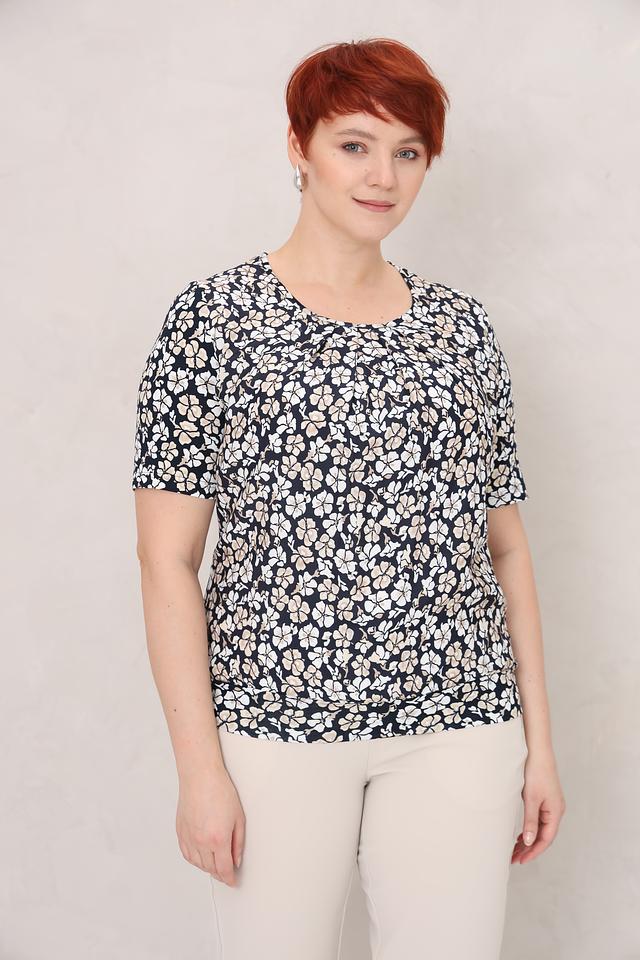 Модель имеет круглый вырез горловины и короткие рукава. Блуза выполнена из высококачественной вискозы с добавлением эластана, что обеспечивает приятные тактильные ощущения и хорошую посадку по фигуре. Ткань легкая и дышащая, что делает блузу комфортной в носке даже в жаркую погоду.