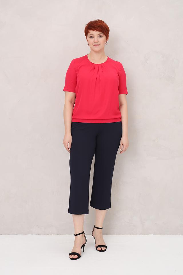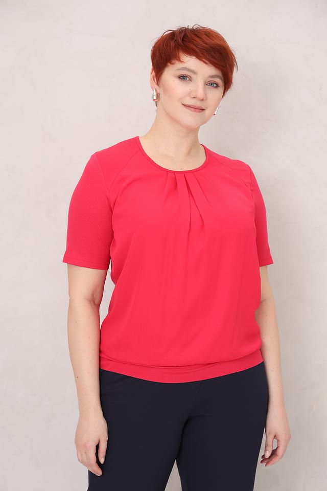 Модель имеет классический крой с короткими рукавами и округлым вырезом горловины. Особый акцент сделан на декоративную драпировку в области груди, которая придает блузе изысканность и элегантность.