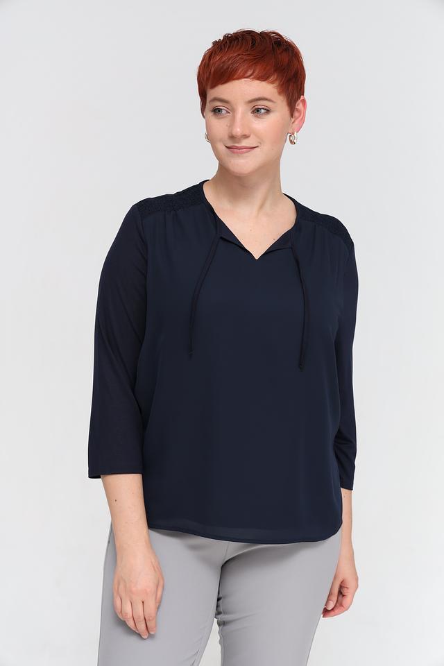 Темно-синяя блуза Frank Walder из вискозы с добавлением эластана. Модель имеет V-образный вырез, короткие рукава и декоративные завязки на горловине, которые придают образу женственность. Состав: вискоза 93%, эластан 7%
