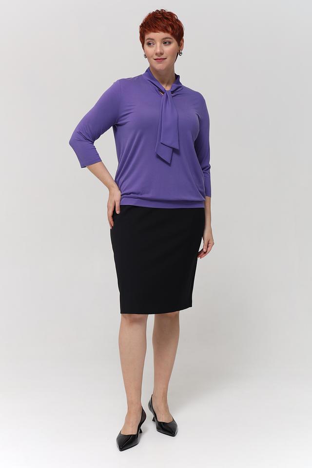 Блуза имеет лавандовый цвет и классический крой с рукавами длиной 3/4. Особый акцент сделан на воротнике, украшенном элегантным бантом, который придает образу женственность и изысканность.