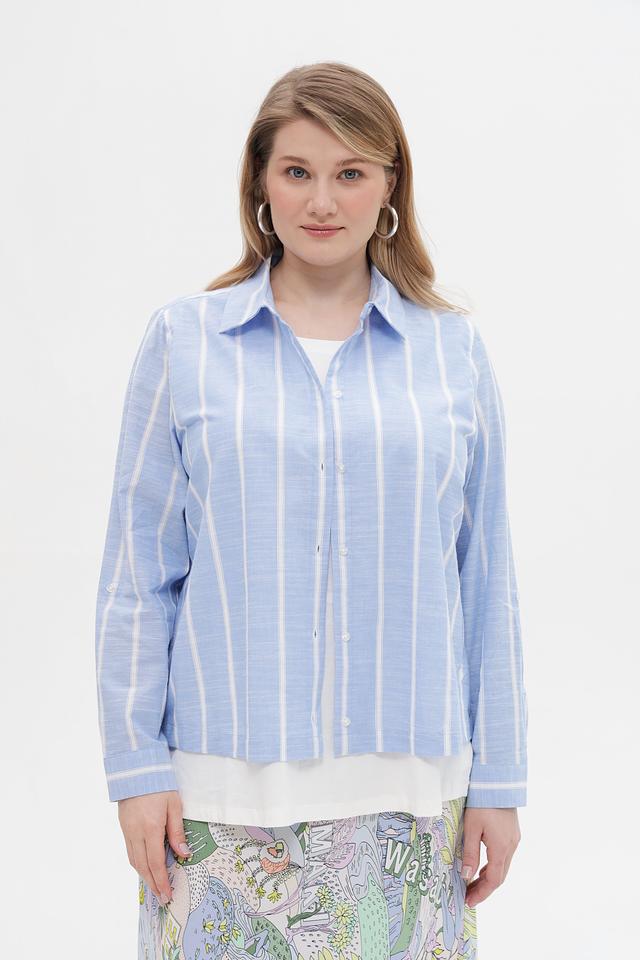 Голубая блузка Frapp в тонкую полоску выполнена из 100% хлопка. Классический крой с длинными рукавами и воротником придаст образу свежесть и легкость. Идеально сочетается с юбками и брюками. Состав: хлопок 100%