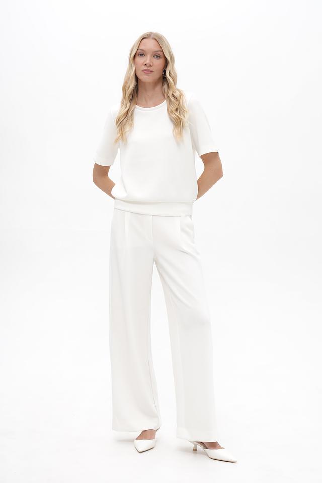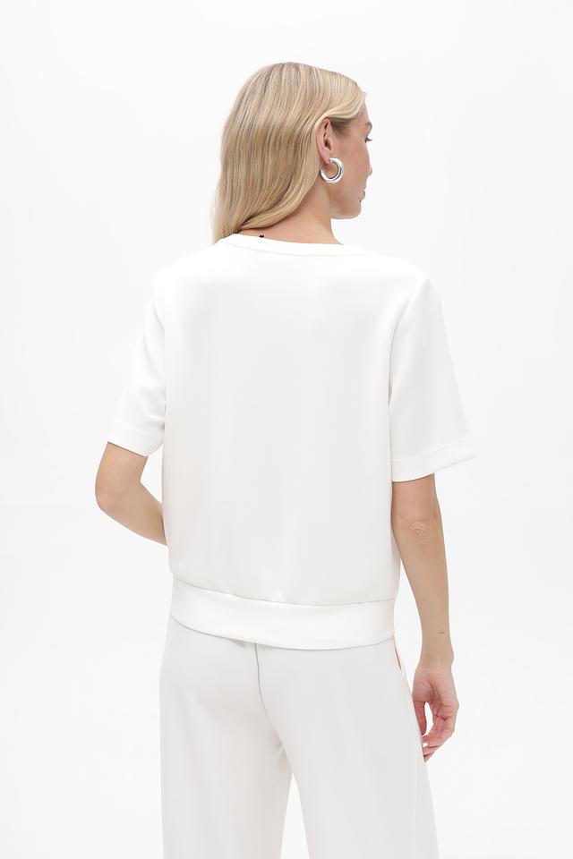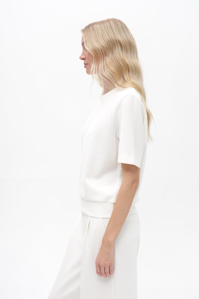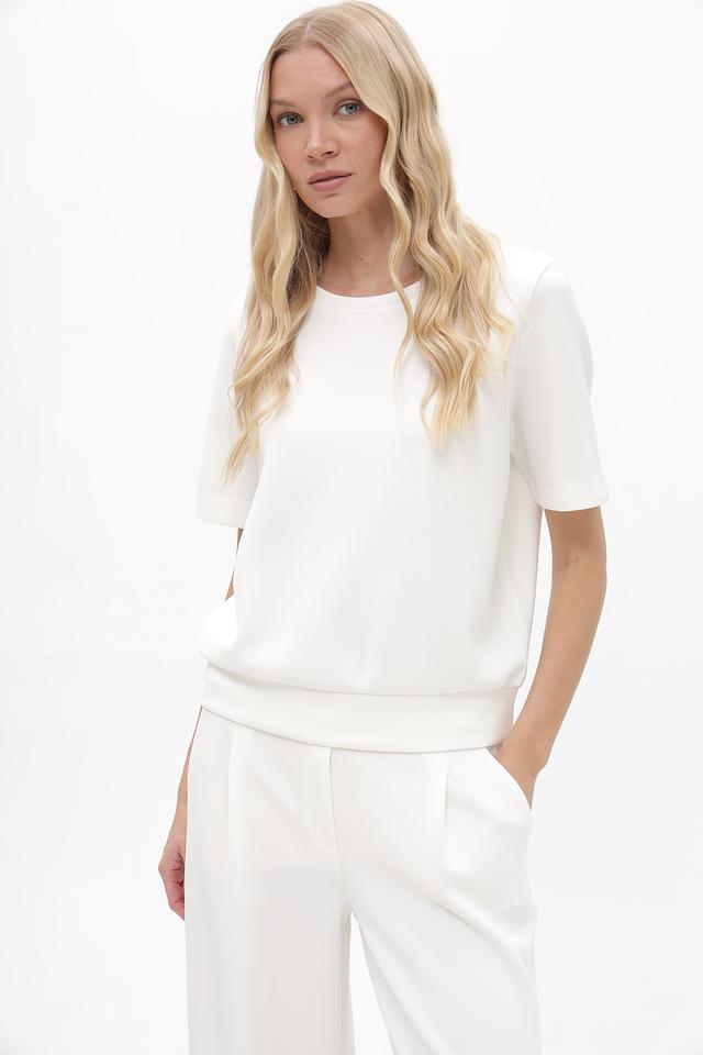 Модель имеет прямой крой, короткие рукава и круглый вырез горловины. Блуза выполнена из приятной на ощупь ткани, состоящей из модала (48%), полиэстера (47%) и эластана (5%). Такое сочетание материалов обеспечивает комфорт, воздухопроницаемость и легкую эластичность.
