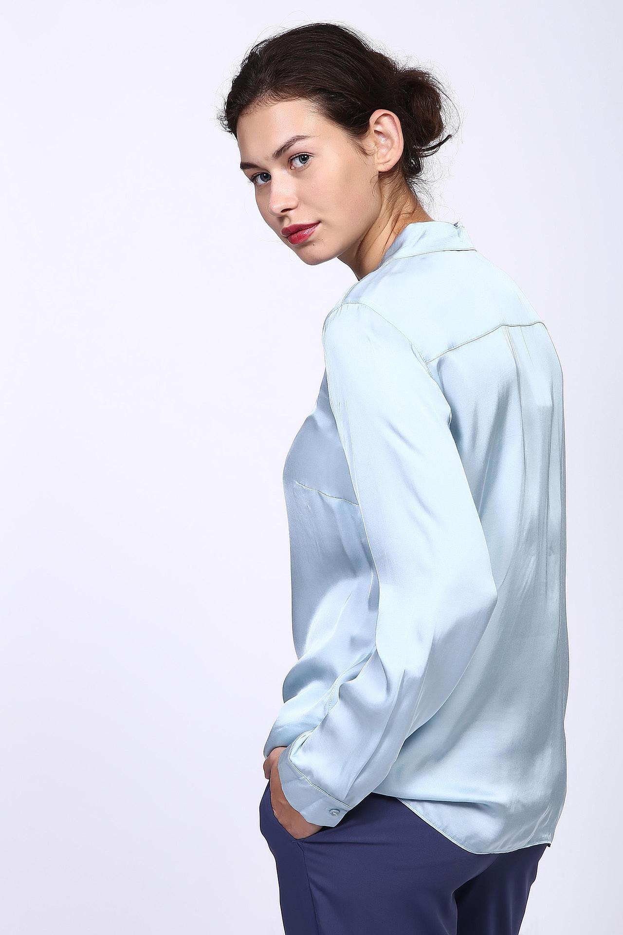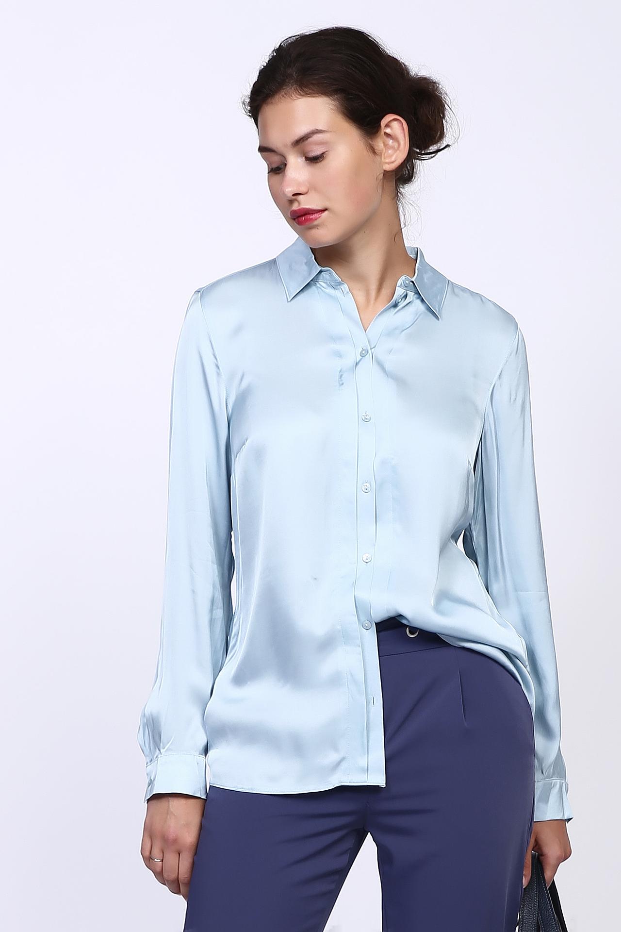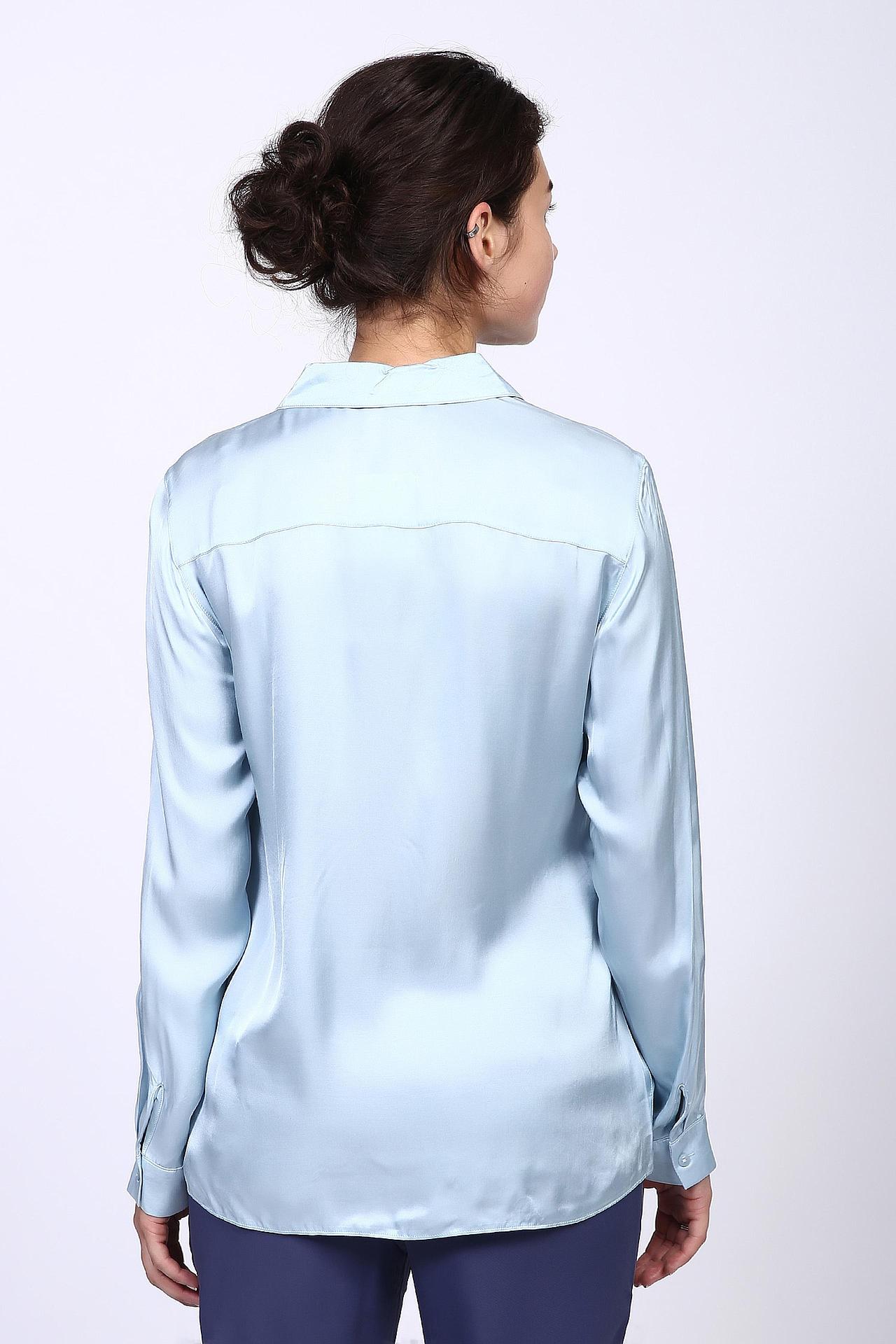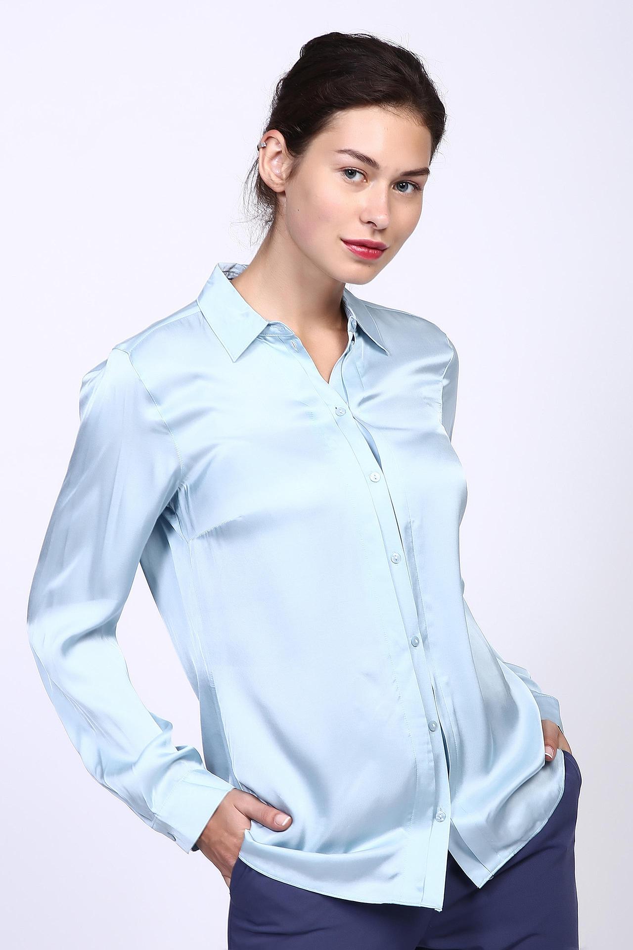 - Дизайн: Классический крой с отложным воротником и длинными рукавами на манжетах. Прямой силуэт подчеркивает фигуру, не сковывая движений, что делает блузку идеальной для любого типа телосложения.
