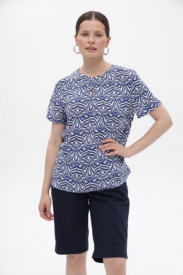 Особенностью этой блузы является яркий и оригинальный геометрический принт в синих и белых тонах. Он придаёт блузе неповторимый стиль и делает её отличным акцентом в вашем образе. Блуза идеально сочетается с брюками, юбками и джинсами.