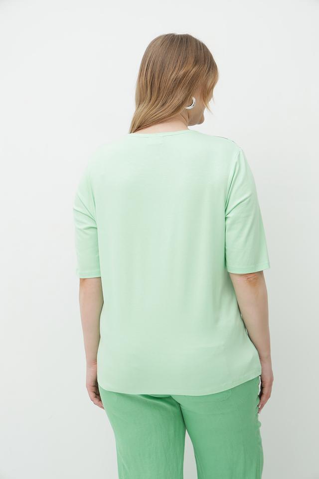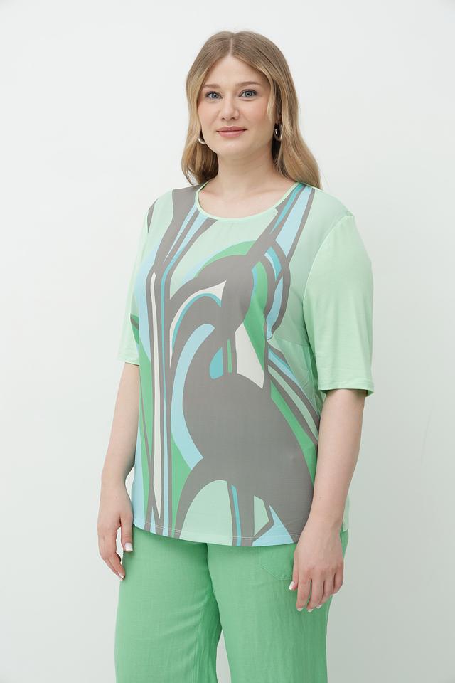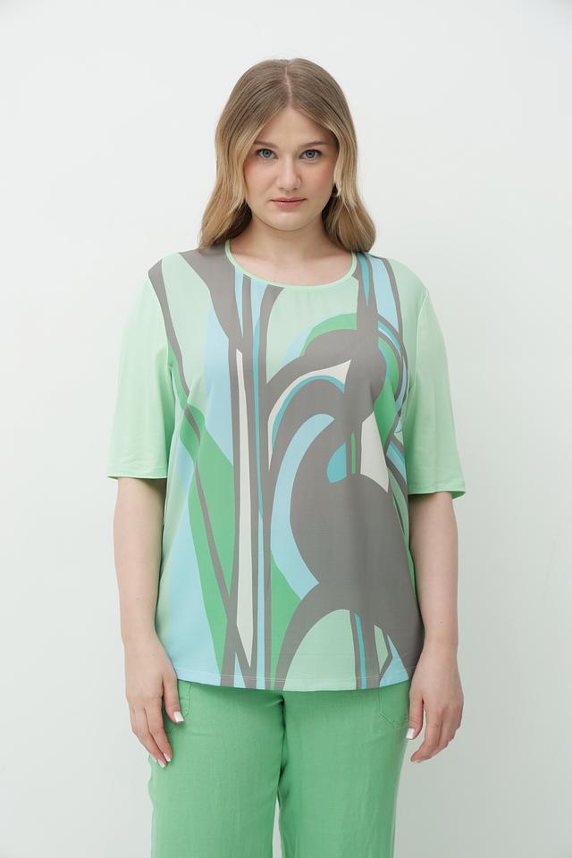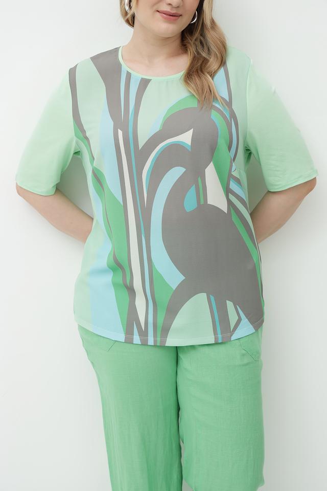 Блузка имеет свободный крой, короткие рукава и округлый вырез горловины. Главная особенность модели – эффектный абстрактный принт, сочетающий в себе оттенки зелёного, голубого и серого. Такой рисунок делает блузку уникальной и привлекательной.