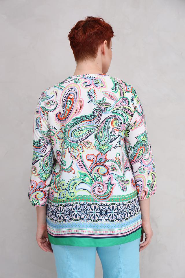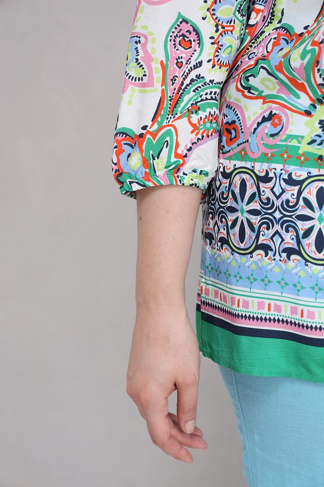 Эта стильная блуза от Lebek выполнена в белом цвете и украшена эффектным принтом пейсли, выполненным в разнообразных оттенках зеленого, розового и оранжевого. Модель имеет удобный V-образный вырез горловины и рукава длиной 3/4, что делает ее подходящей для создания как повседневных, так и более нарядных образов.