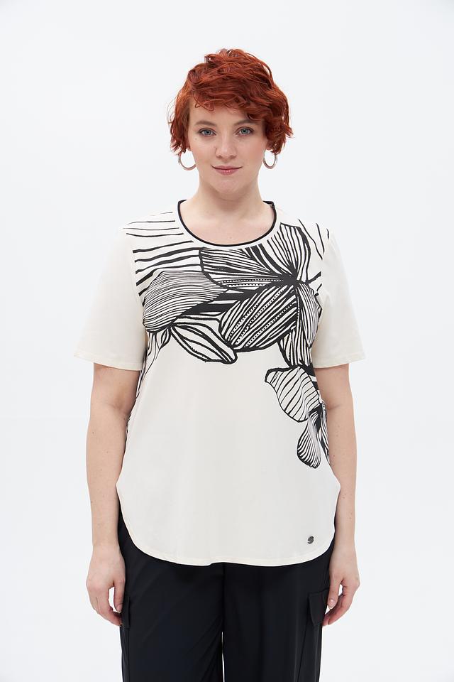 Бежевая блузка Lebek с оригинальным цветочным принтом. Изготовлена из мягкого хлопка с добавлением модала для комфорта. Свободный силуэт и короткие рукава. Состав: хлопок 95%, модал 5%