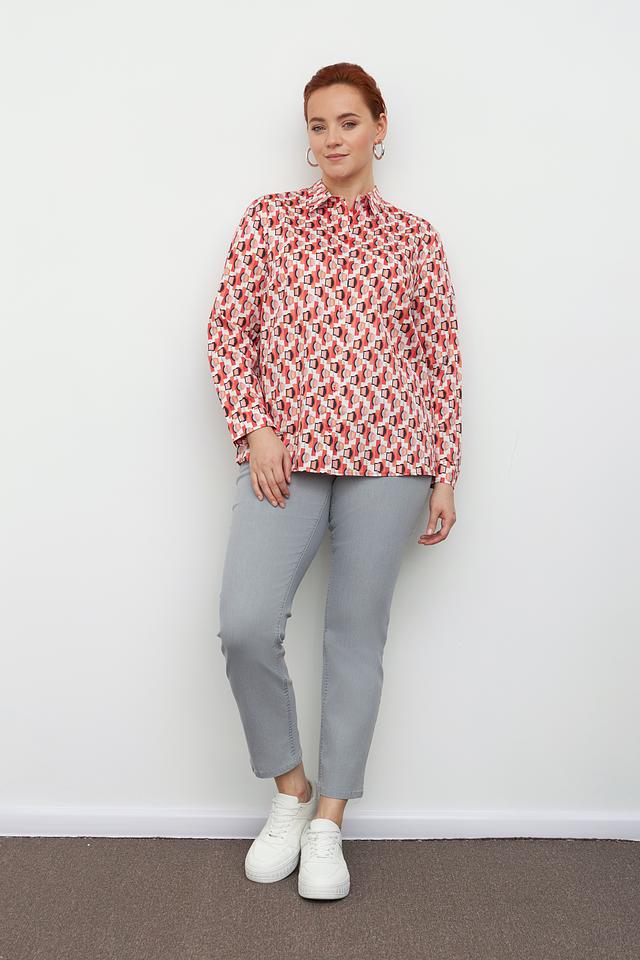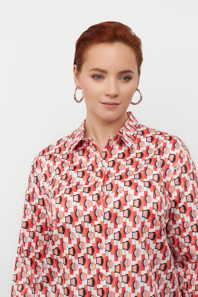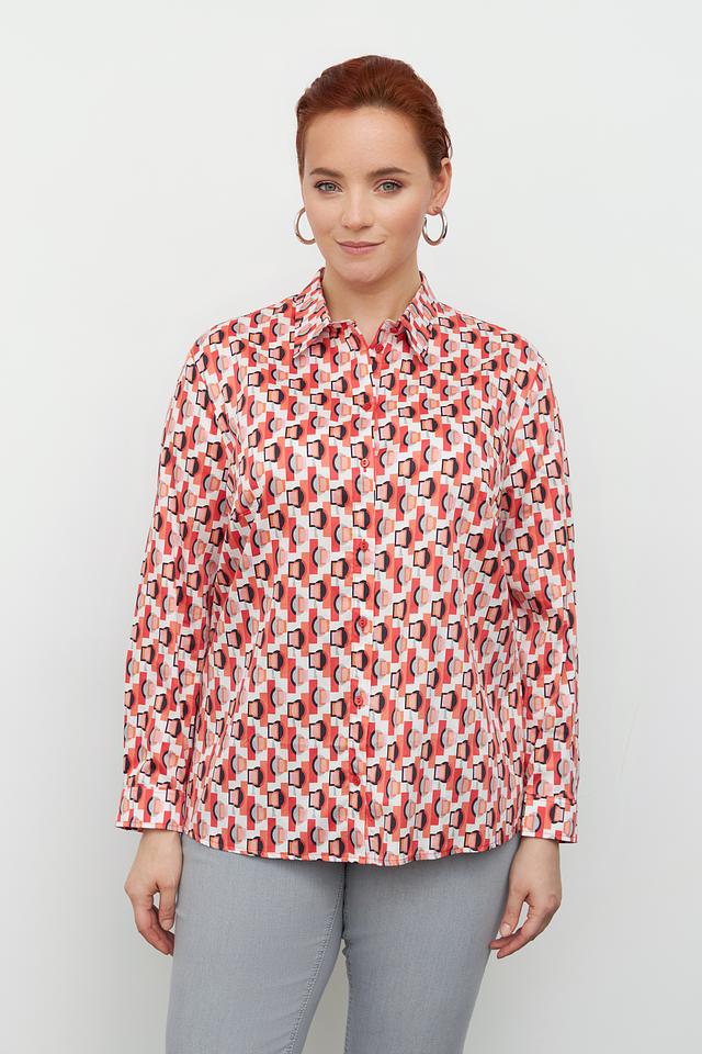 Блуза имеет классический крой с длинными рукавами и отложным воротником. Особенностью модели является оригинальный геометрический принт в оранжево-белой гамме, который придает ей современный и динамичный вид.