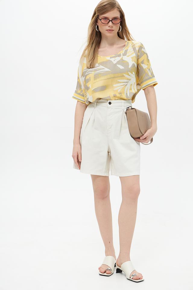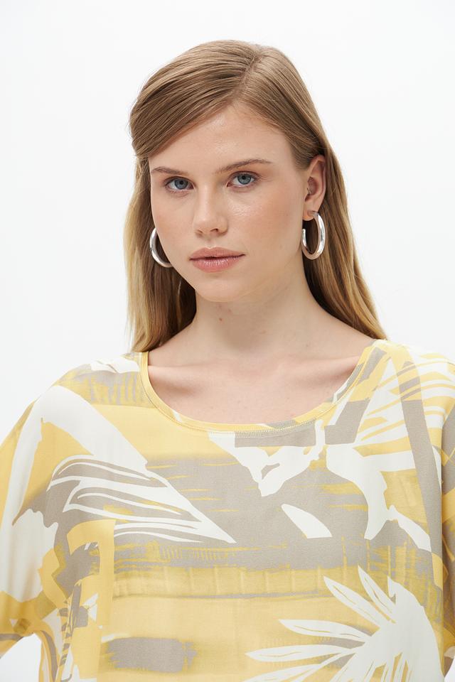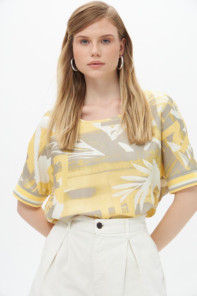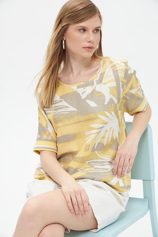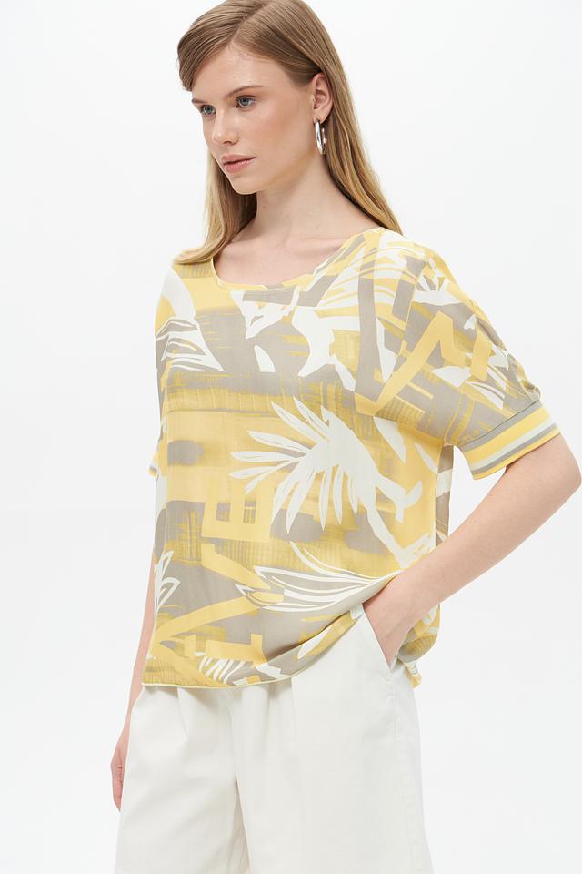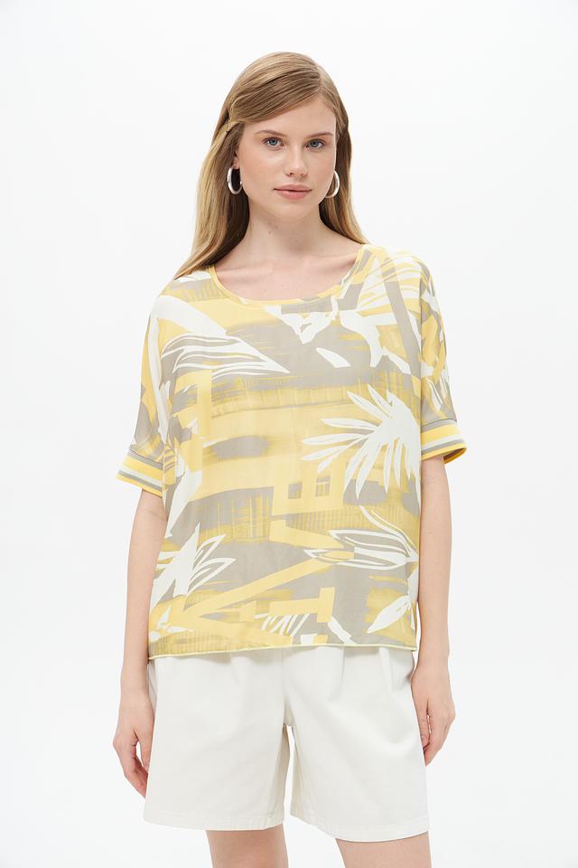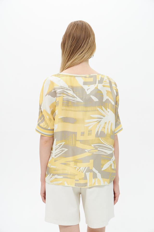Цветовая гамма блузы включает в себя оттенки жёлтого, серого и бежевого. Состав ткани: 96% вискоза, 4% эластан. Эта блуза идеально подойдет для создания повседневных и летних образов. Её можно сочетать с шортами, юбками или брюками.