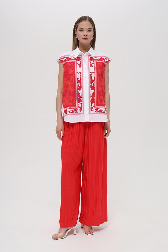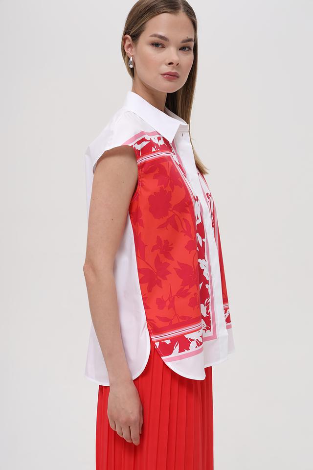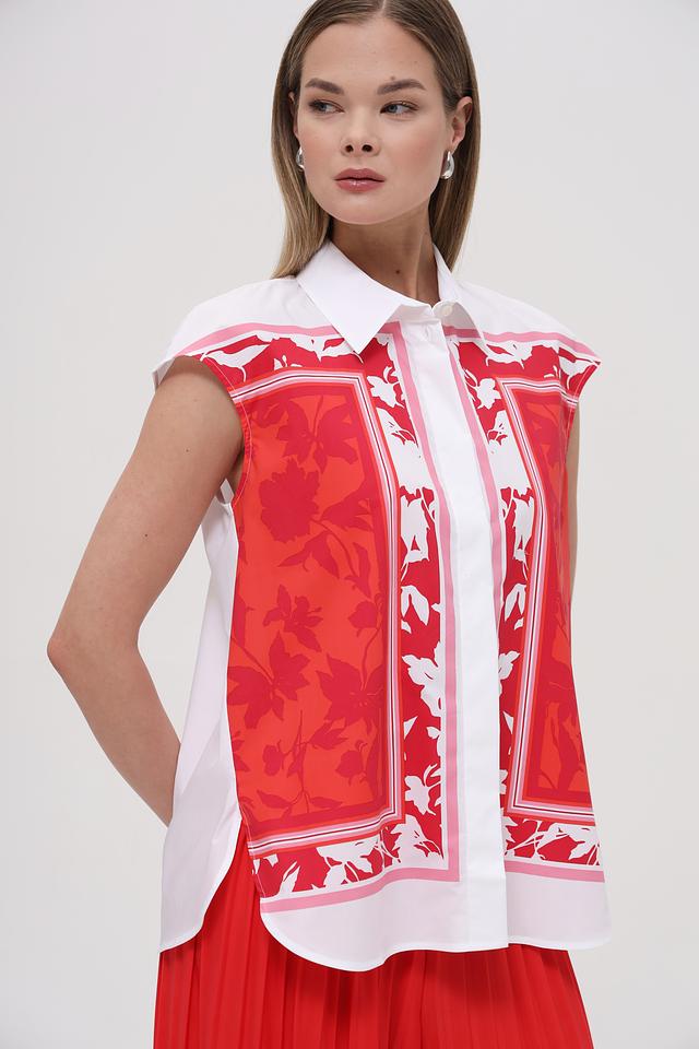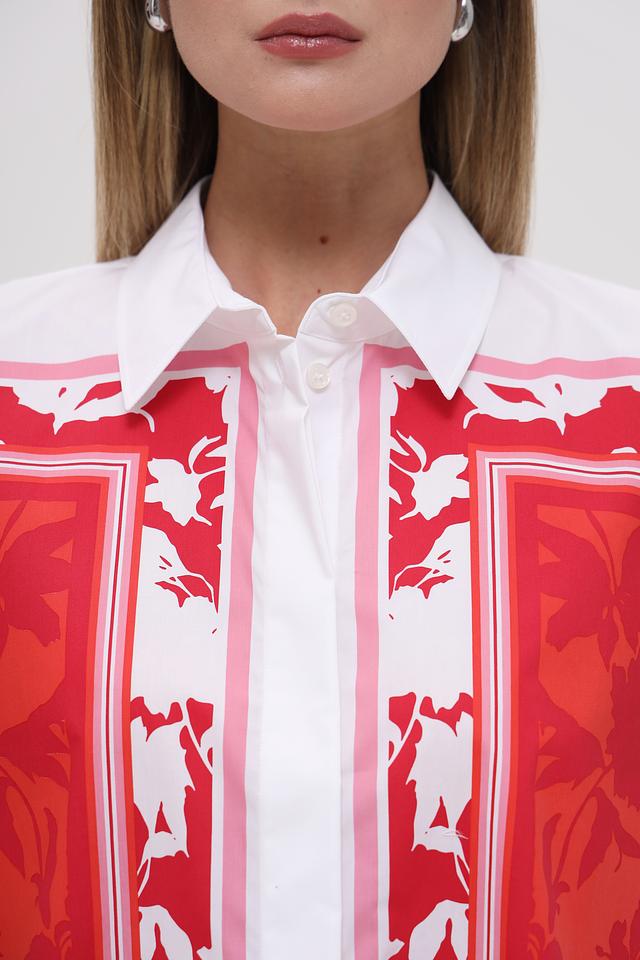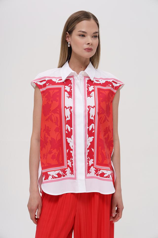 Основной цвет блузы – белый, однако центральная часть украшена крупным цветочным принтом в красных тонах. Такое сочетание делает блузу универсальной и подходящей для различных случаев – от повседневной носки до особых мероприятий. Задняя часть блузы выполнена из однотонного белого хлопка.