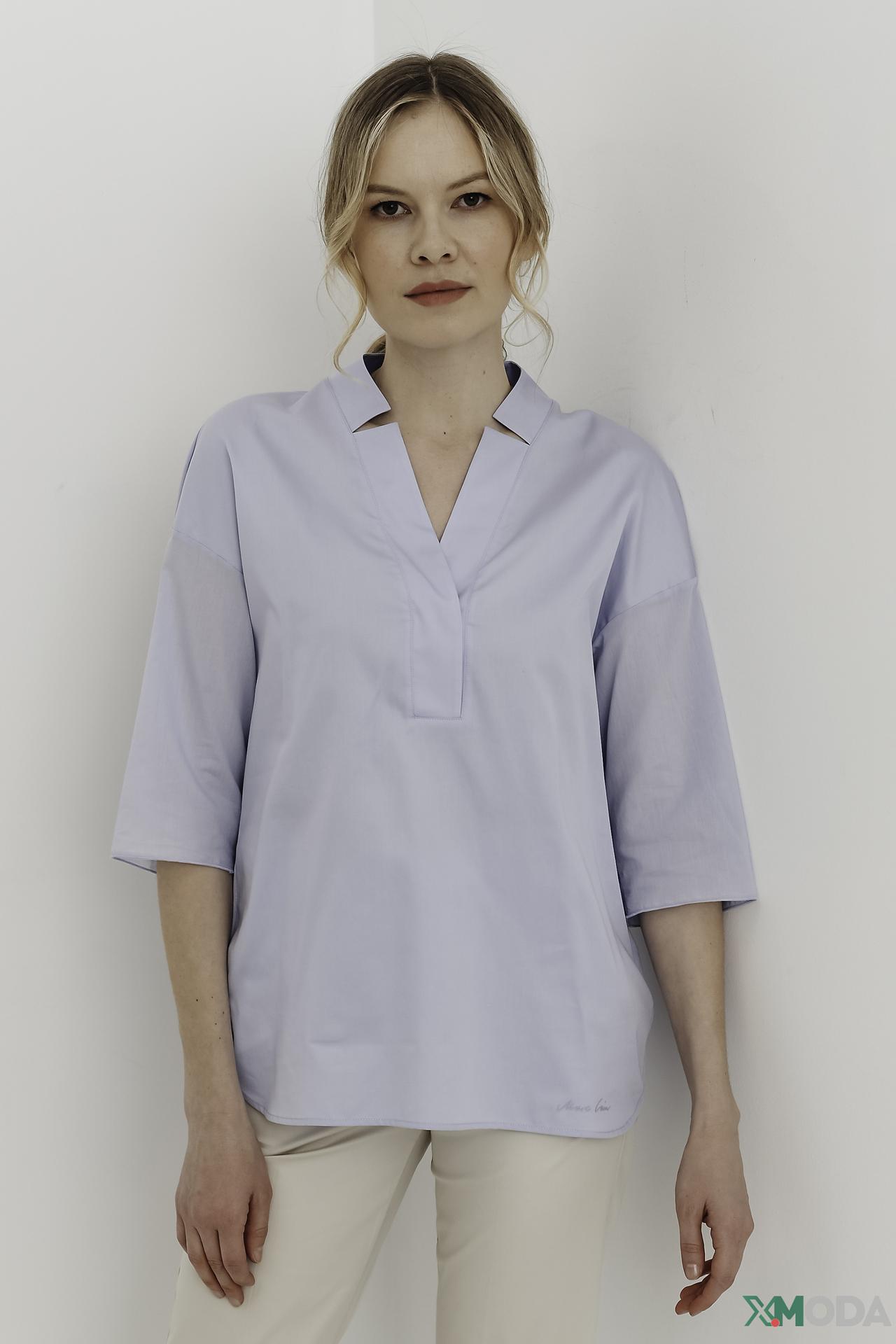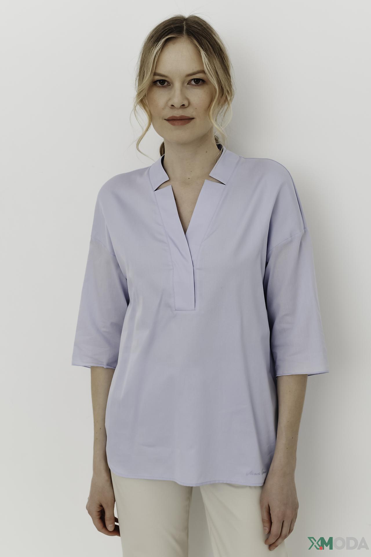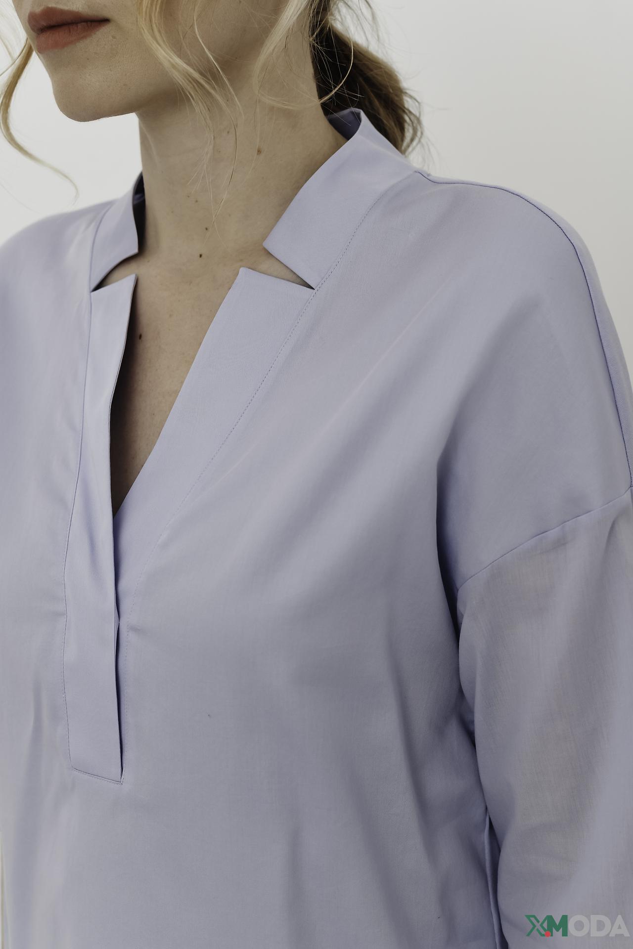Модель отличается лаконичным дизайном и безупречным кроем. Прямой силуэт блузы выгодно подчеркивает фигуру, а V-образный вырез визуально удлиняет шею. Рукава длиной 3/4 добавляют образу нотку изысканности.