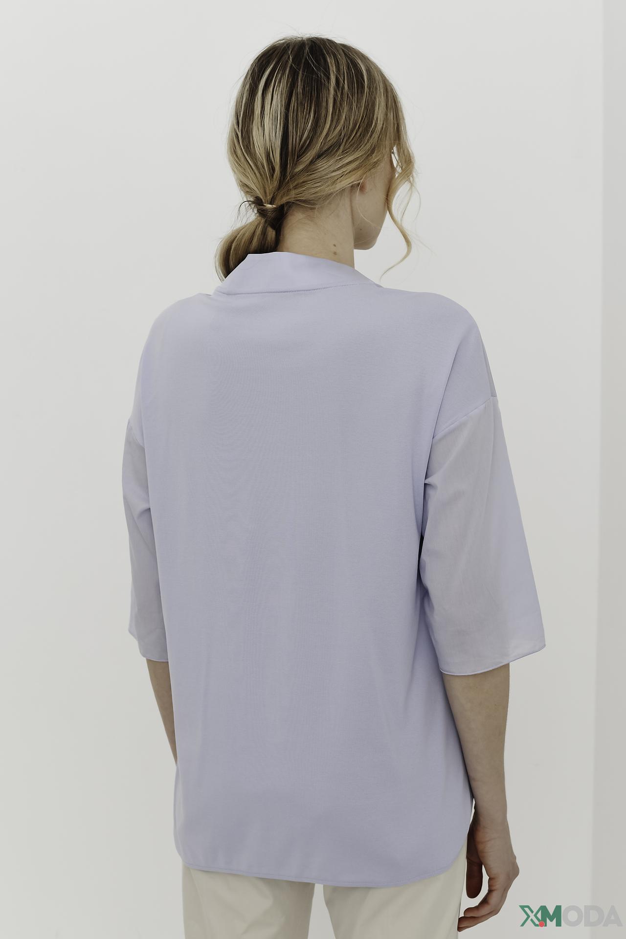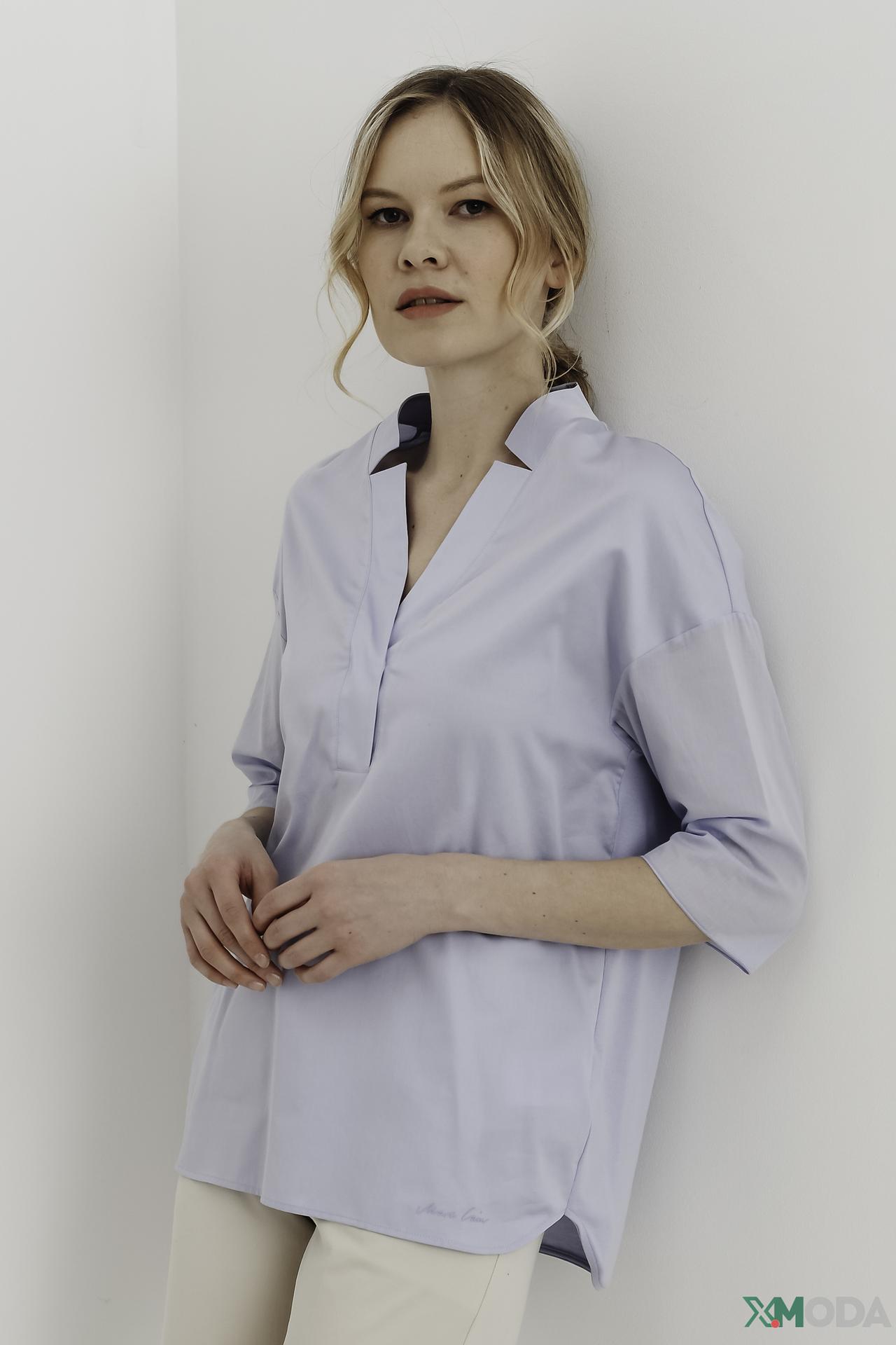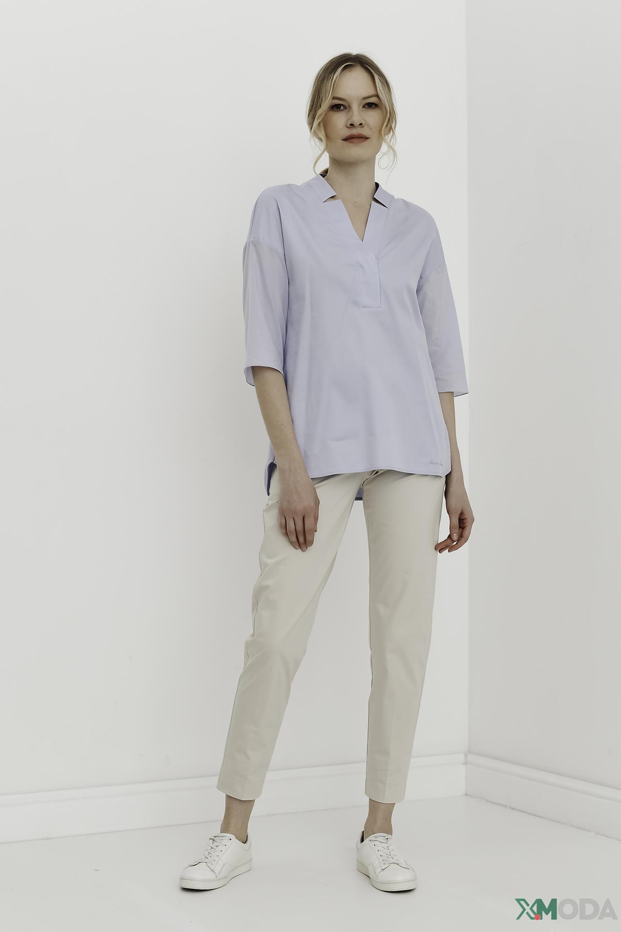 Модель отличается лаконичным дизайном и безупречным кроем. Прямой силуэт блузы выгодно подчеркивает фигуру, а V-образный вырез визуально удлиняет шею. Рукава длиной 3/4 добавляют образу нотку изысканности.