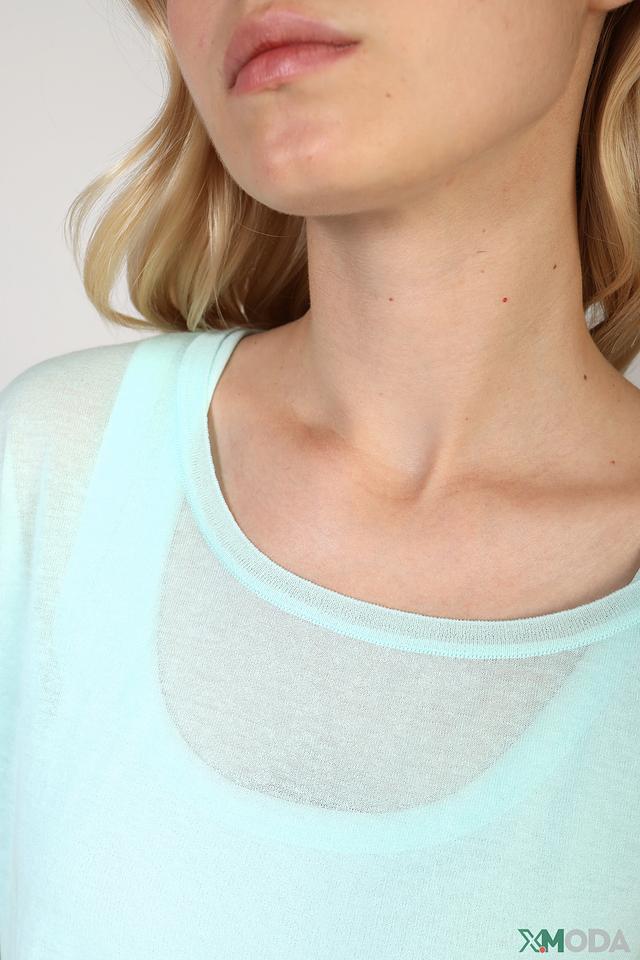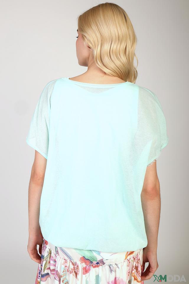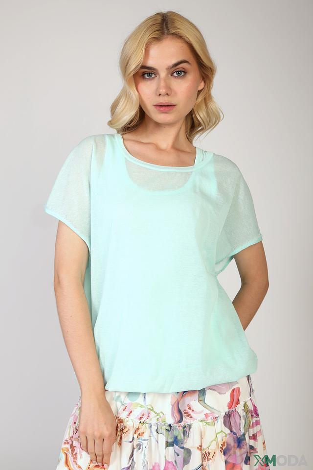 Мятная блуза Marc Cain с короткими рукавами, выполненными из сетчатой ткани. Модель имеет свободный крой и V-образный вырез горловины, что придает ей лёгкость и воздушность. Идеально подходит для создания повседневных образов. Состав: хлопок 82%, полиамид 18%