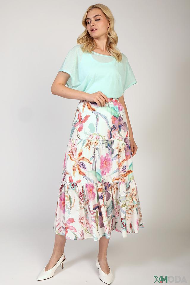 Особенностью модели являются короткие рукава, выполненные из полупрозрачной сетчатой ткани, что добавляет образу легкости и воздушности. V-образный вырез горловины подчеркивает женственность силуэта.