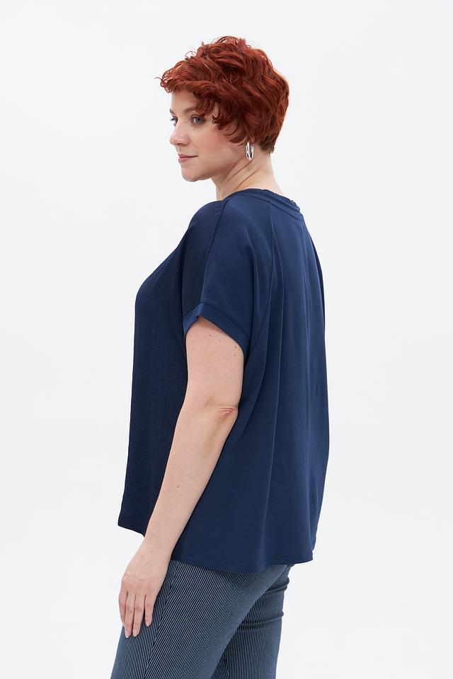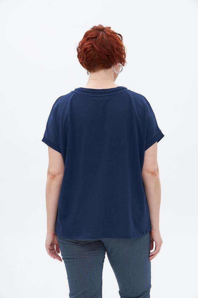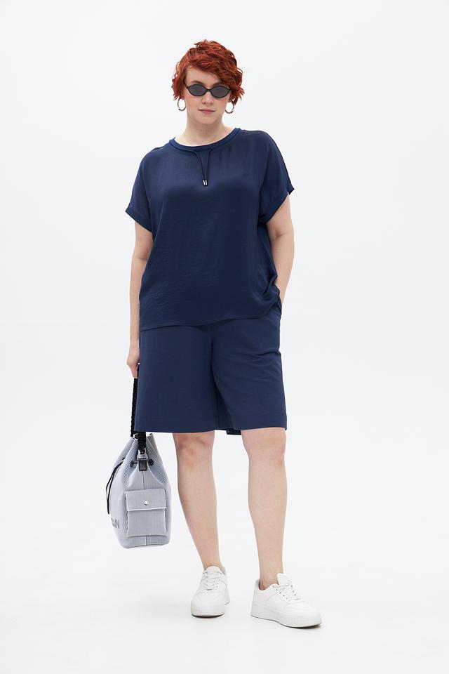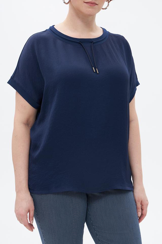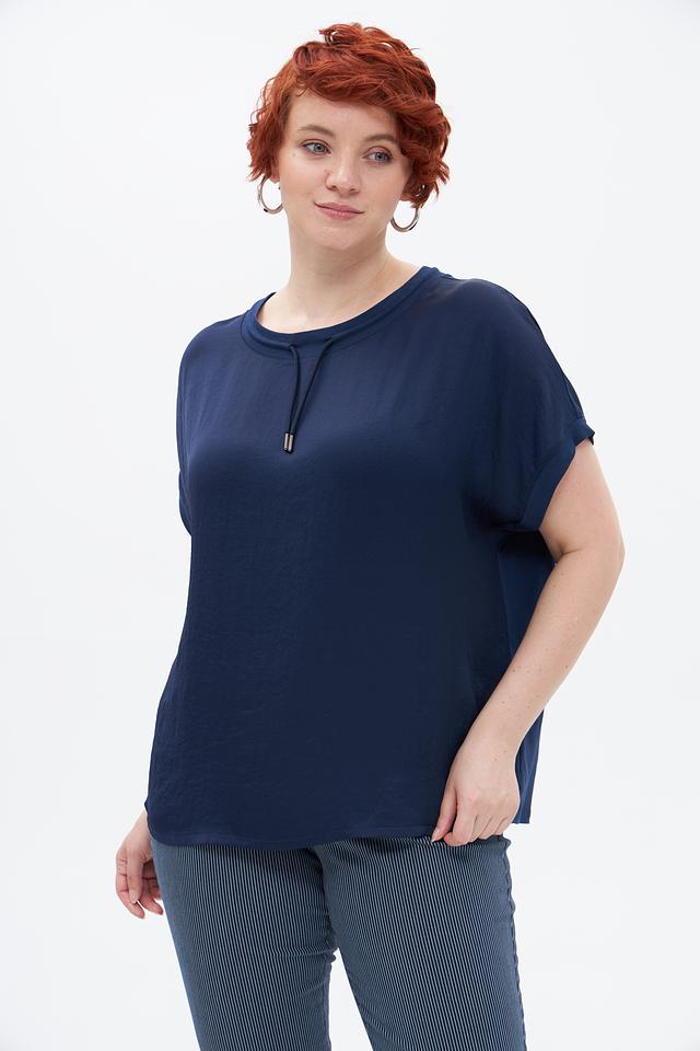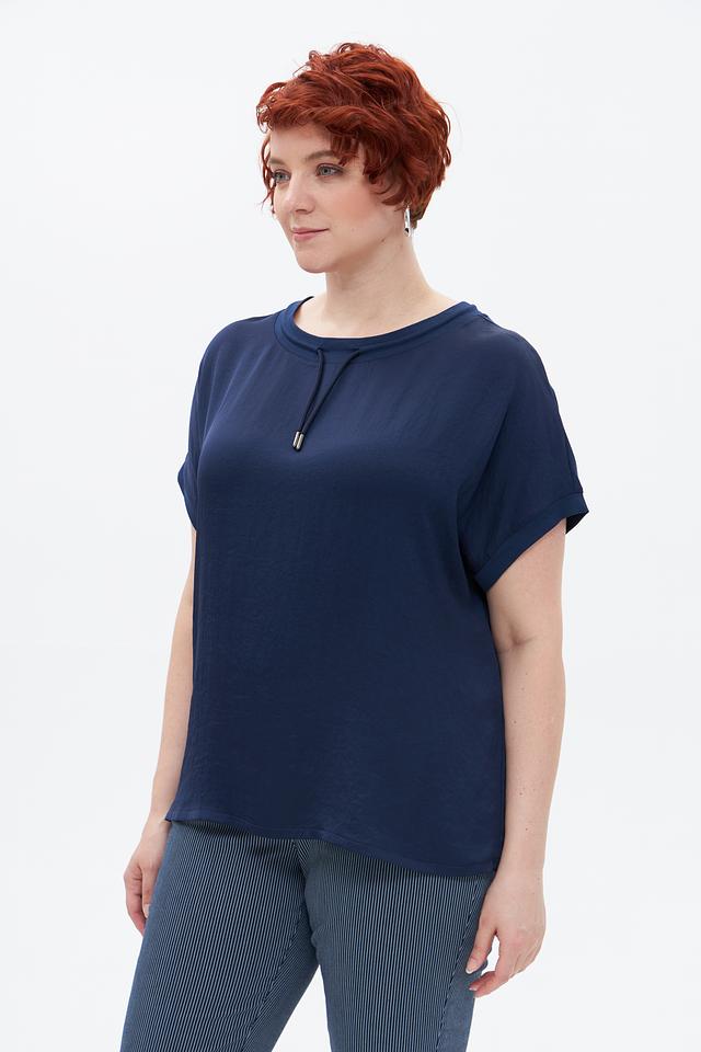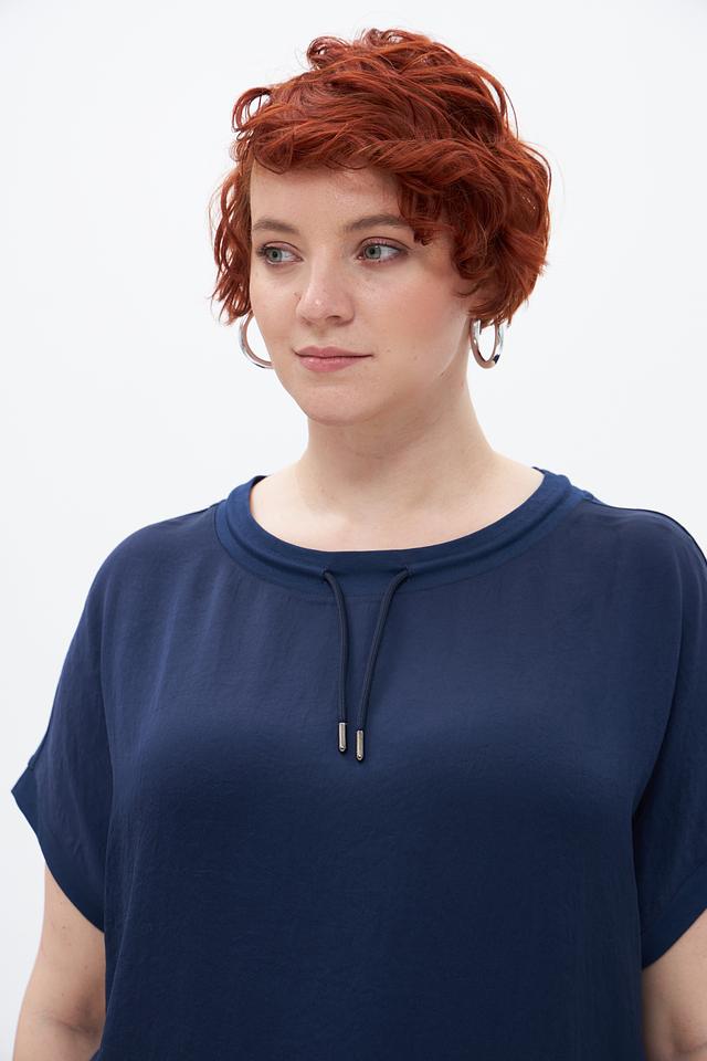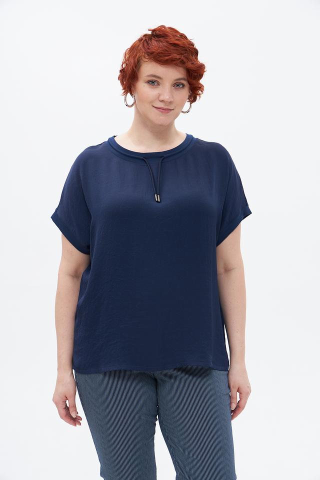 Модель имеет прямой крой, короткие рукава и округлый вырез горловины, украшенный двумя тонкими завязками. Завязки добавляют блузе оригинальности и позволяют регулировать глубину выреза. Благодаря своему лаконичному дизайну, эта блуза легко сочетается с различными предметами гардероба – от классических брюк до джинсов и юбок.