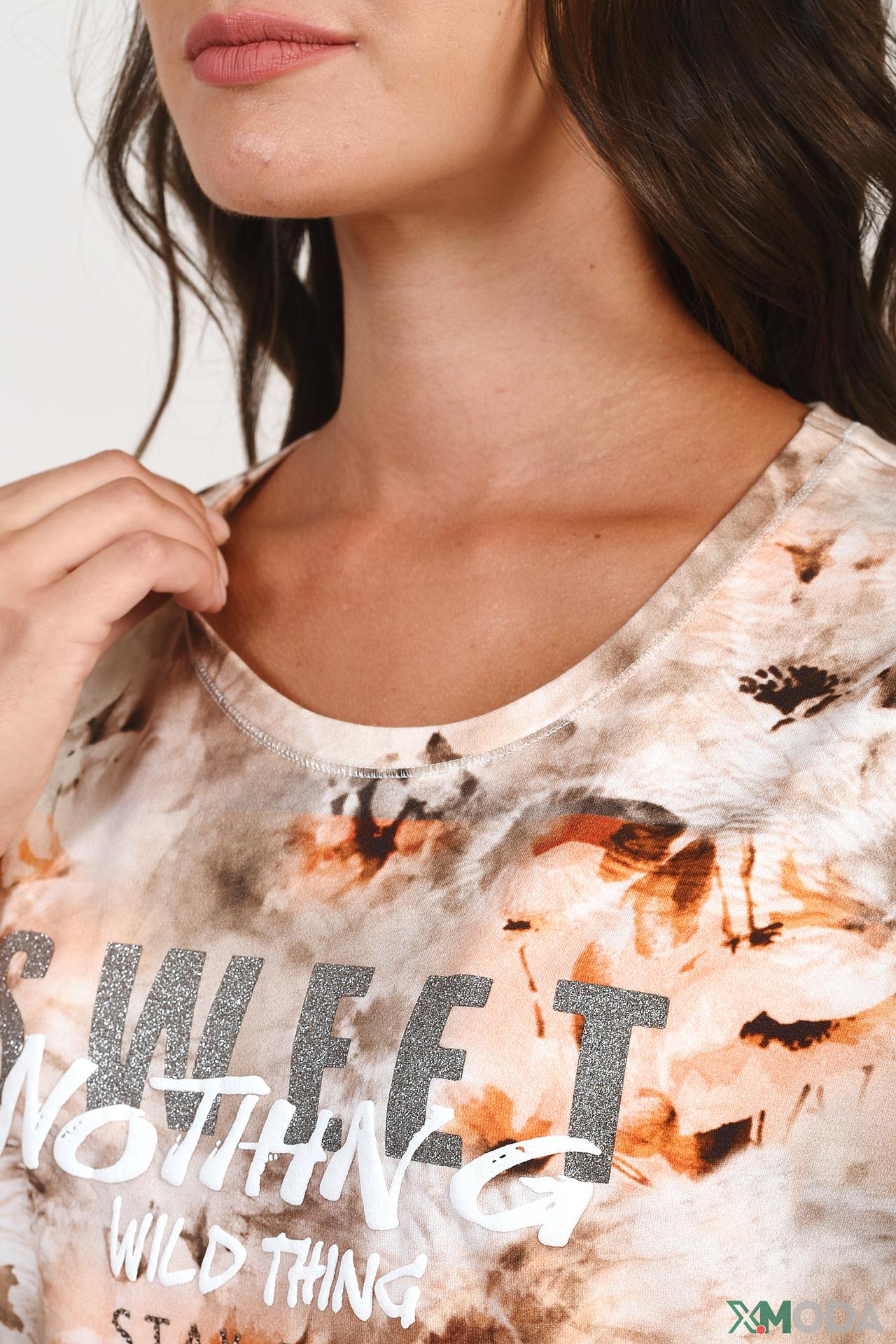 Модель свободного кроя с короткими рукавами и округлым вырезом горловины. Декорирована ярким абстрактно-цветочным принтом и блестящей надписью "SWEET NOTHING WILD THING STAR CLUB". Завязки по низу изделия позволяют регулировать посадку, создавая модный акцент на талии.