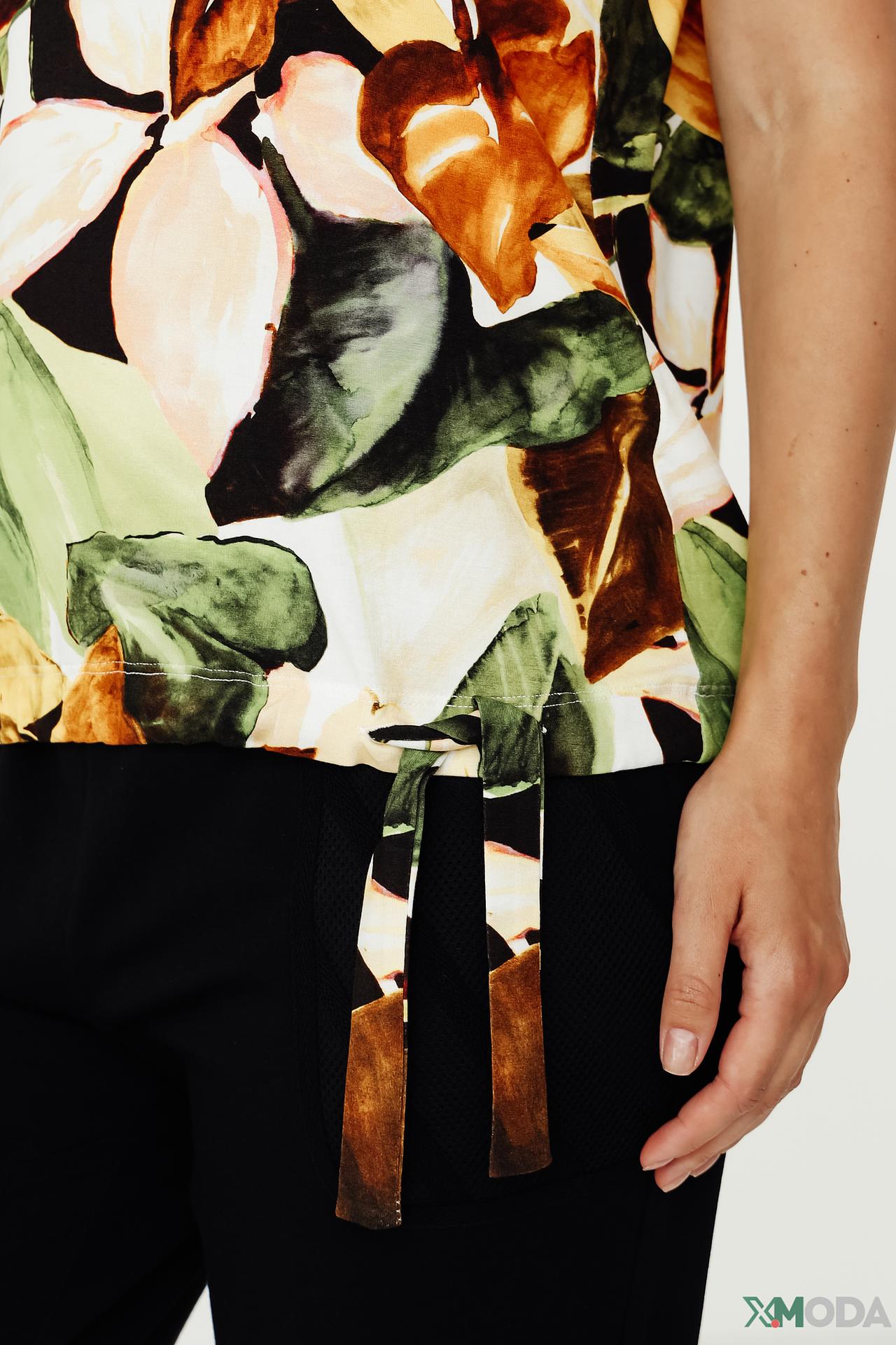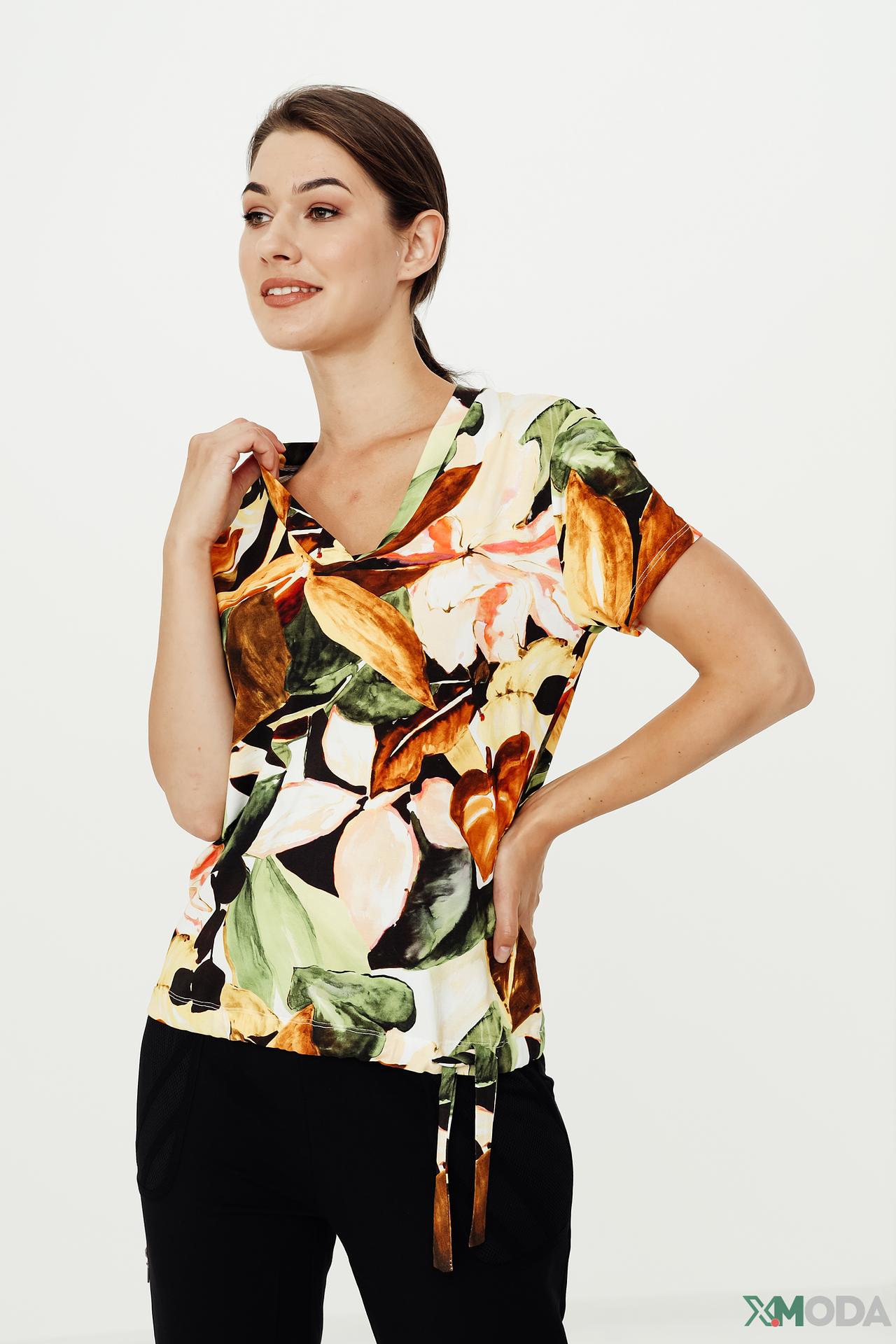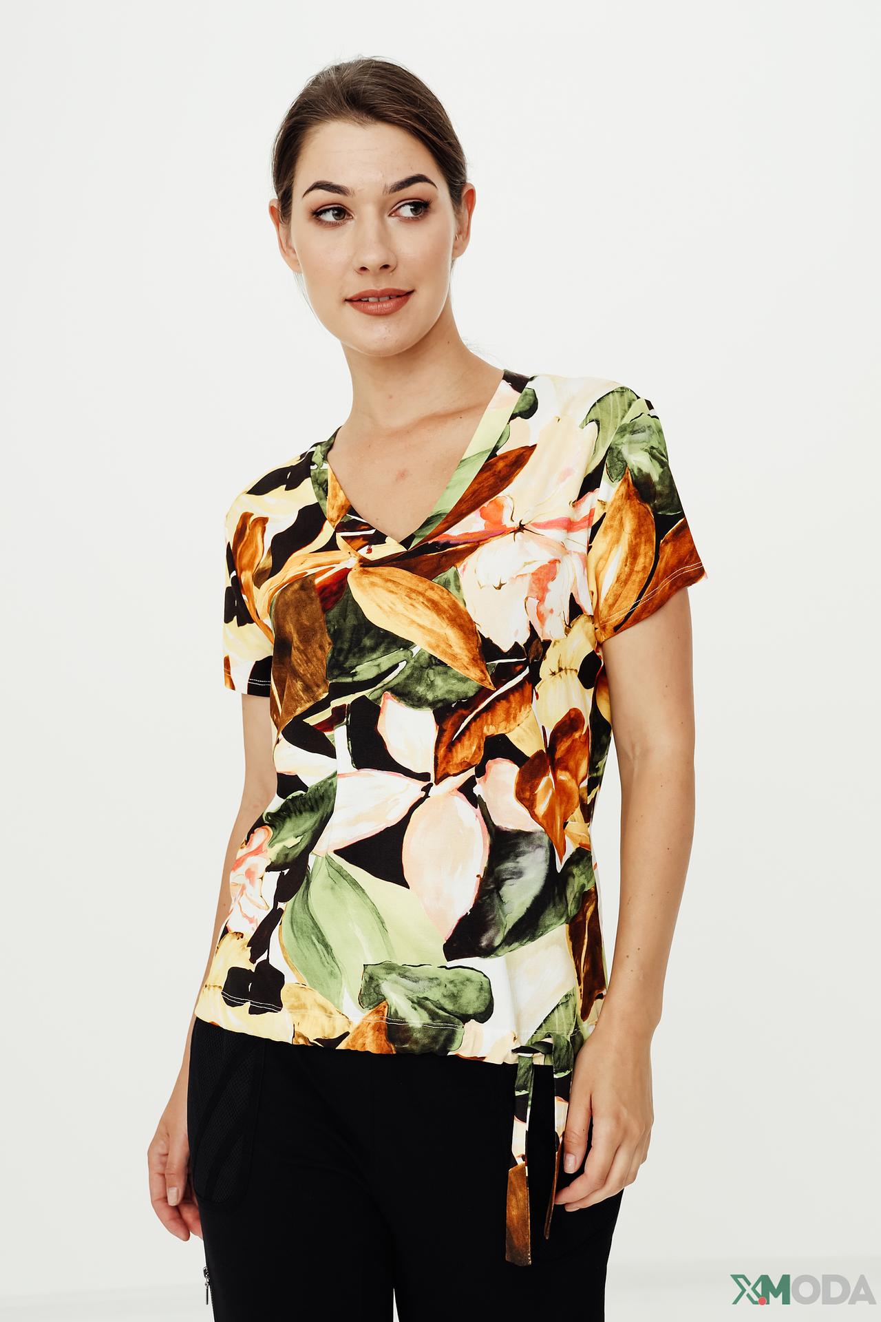 - Дизайн. Блузка с V-образным вырезом и оригинальным принтом, который привлекает внимание.
