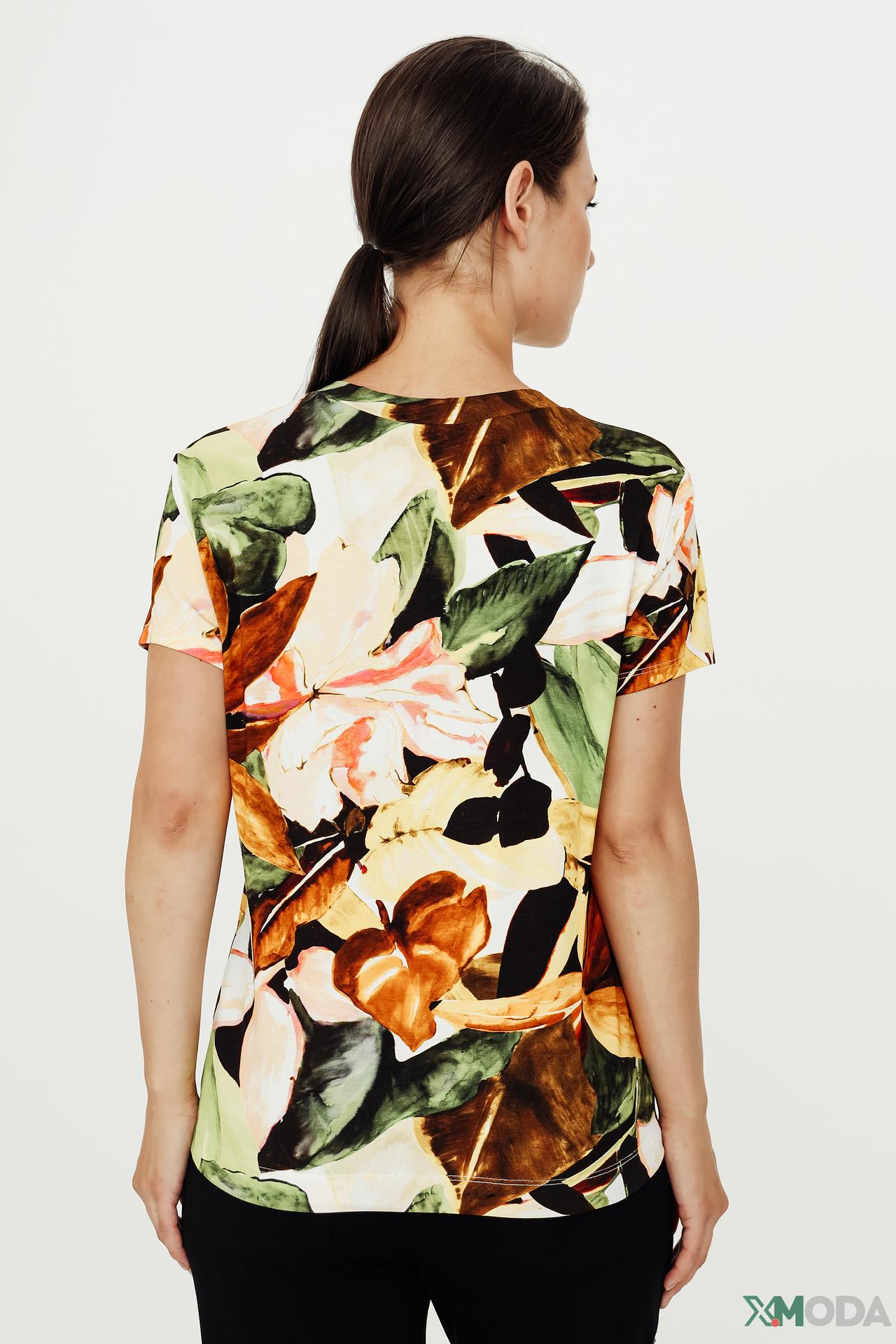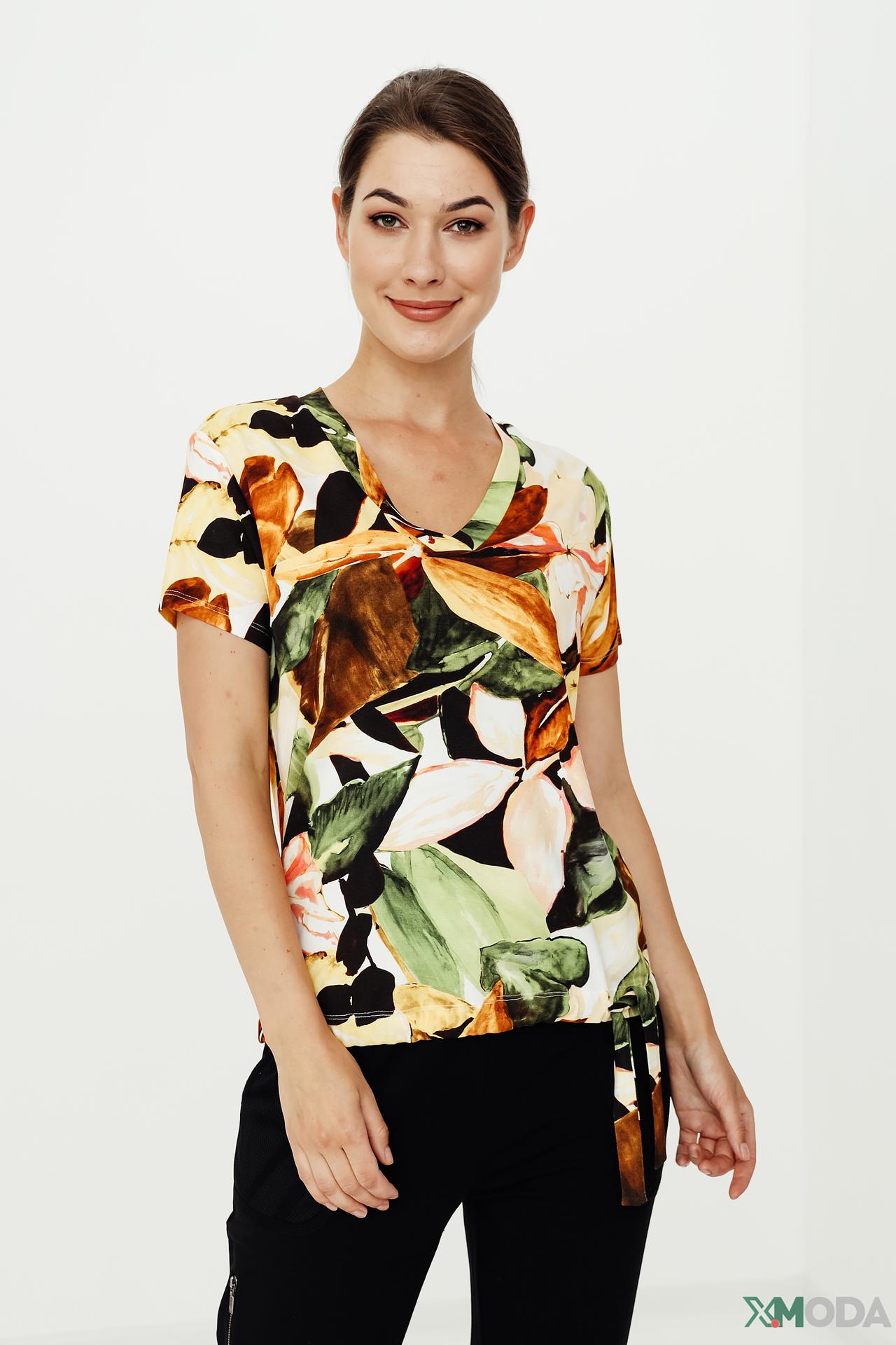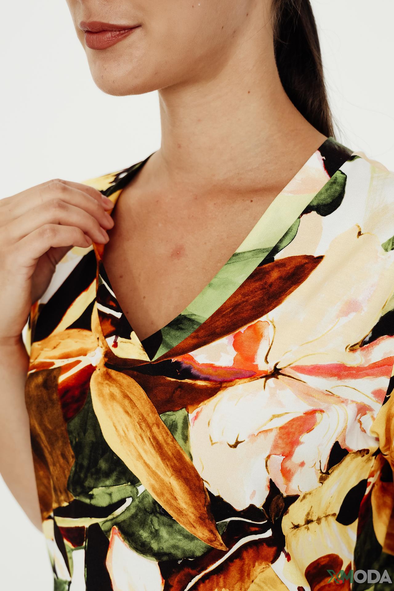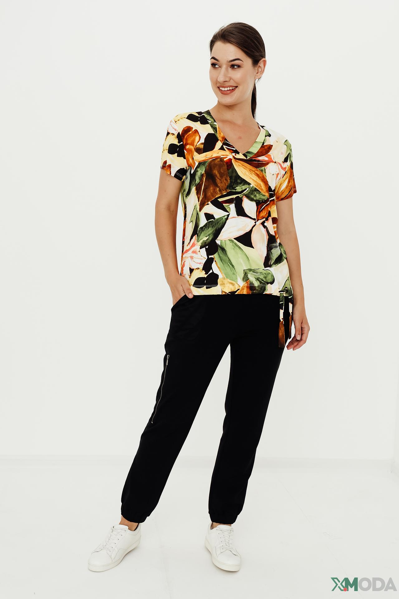 - Дизайн. Блузка с V-образным вырезом и оригинальным принтом, который привлекает внимание.